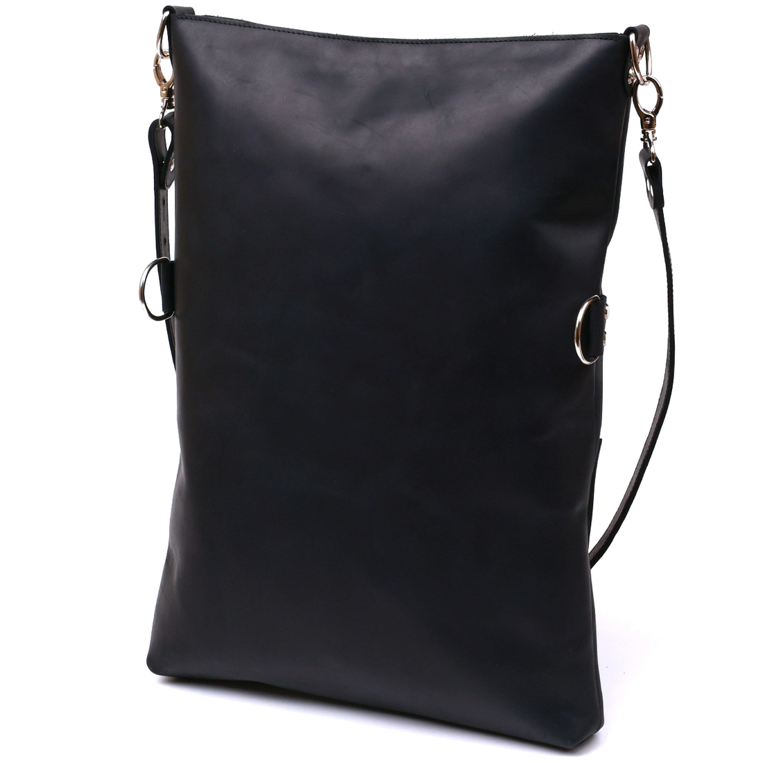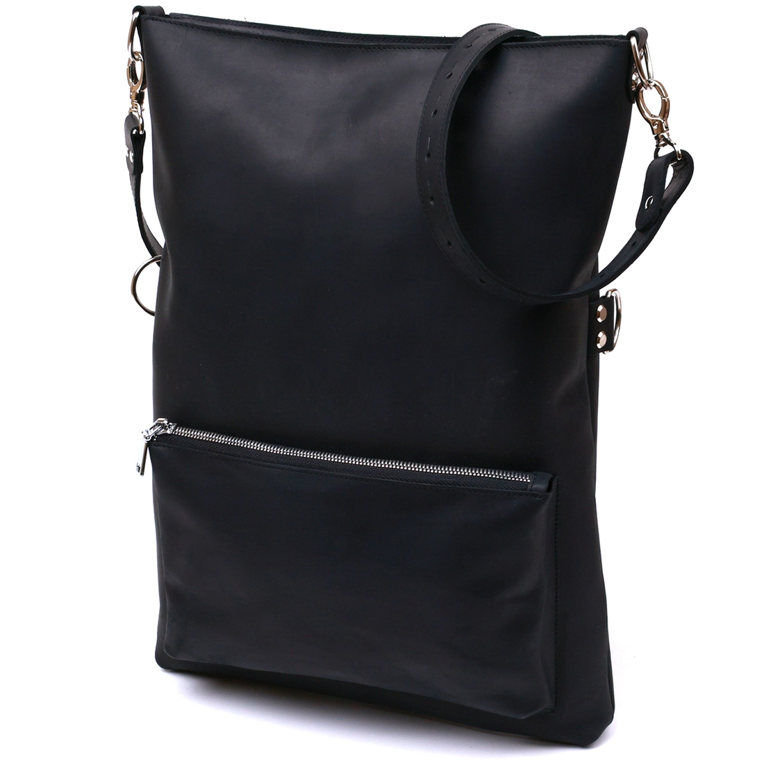 Женская сумка в интересном небанальном дизайне от украинского производителя. Материал изготовления – натуральная кожа с отличными показателями прочности и устойчивости к различного рода износу. Цвет сумки – универсальный черный, фактура – матовая гладкая. Внутреннее отделение очень просторное и вместительное, на внешней стороне есть накладной небольшой карман.