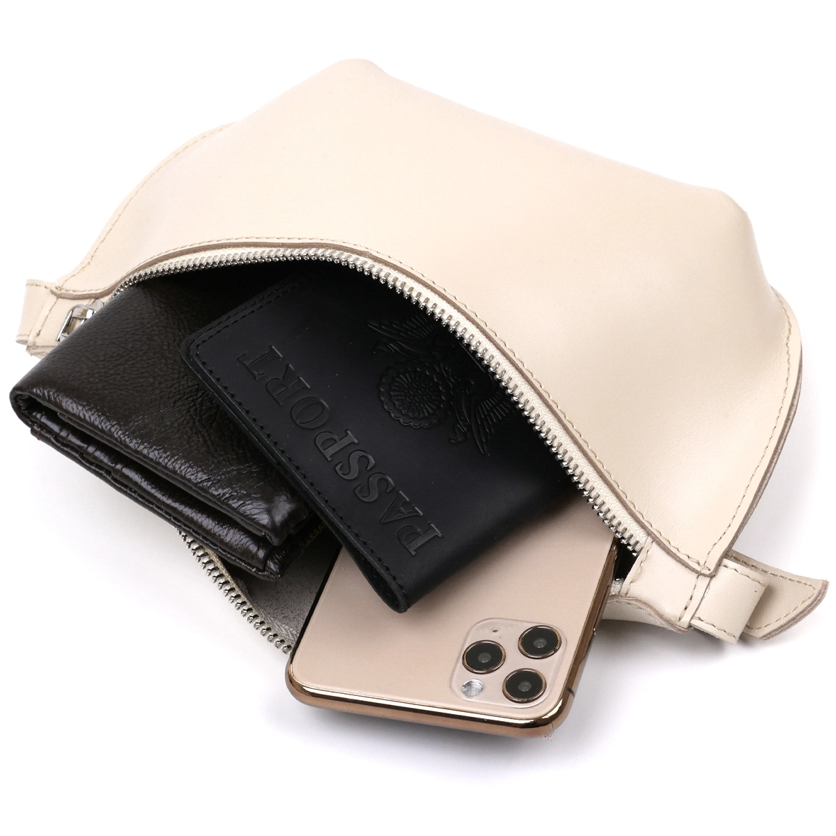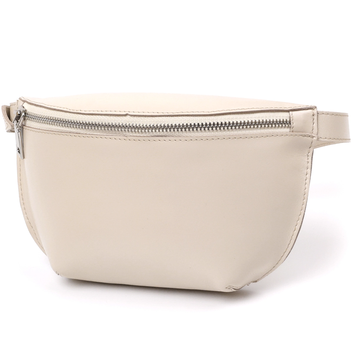 Стильная и современная женская бананка из натуральной кожи высокого качества, которая имеет повышенные характеристики прочности. Имеет одно просторное основное отделение на молнии. Ремешок регулируется по длине и выполнен из натуральной кожи. Цвет изделия – бежевый, фактура – гладкая и очень приятная на ощупь.