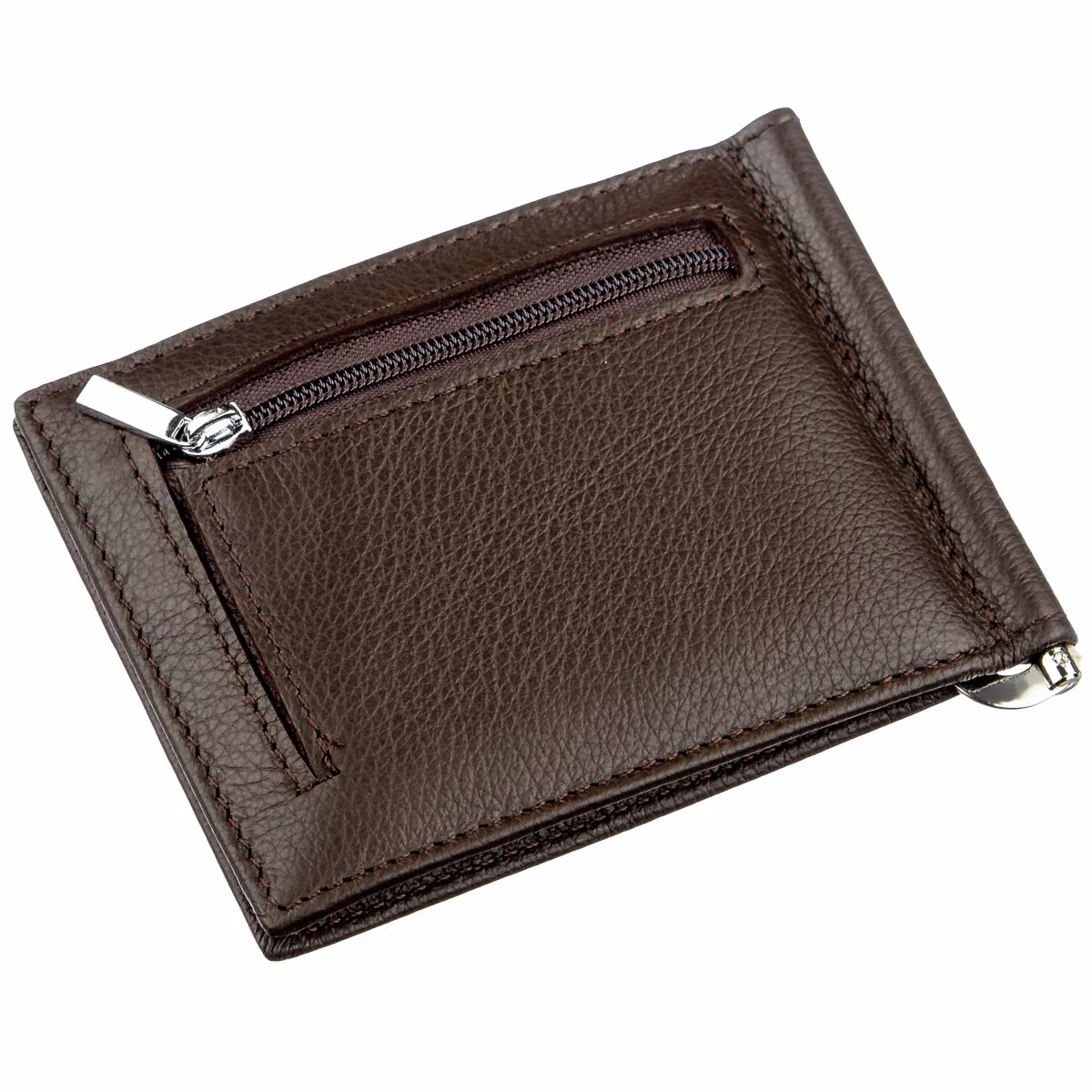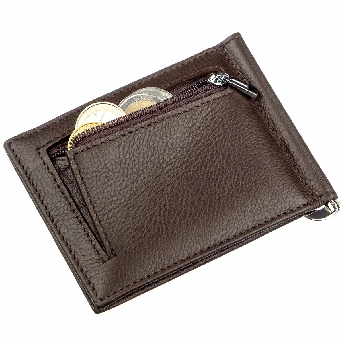 Отличный мужской кожаный зажим для прагматичных и деловых людей. Выполнен из отменной натуральной кожи с высокими показателями износостойкости и качества. Имеет стильный и выдержанный дизайн. Цвет изделия – коричневый, который смотрится очень шикарно и достойно. Наполнение зажима практичное и функциональное. Монетница расположена на внешней стороне и закрывается на молнию. Данный аксессуар уже давно набрал популярность среди мужчин, благодаря своему удобству. Поэтому он станет несомненно прекрасным приобретением для Вас лично или для любимого человека. Упакован зажим в белую картонную коробку.
