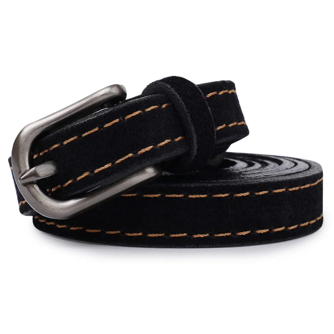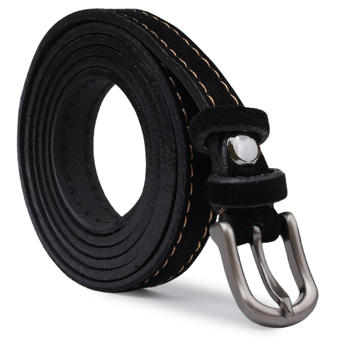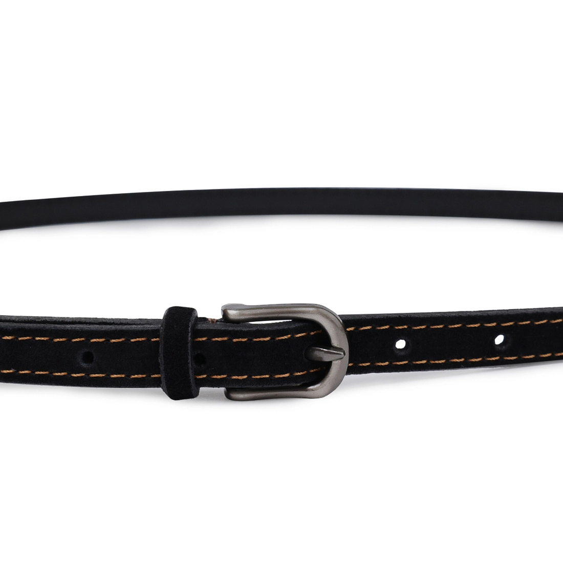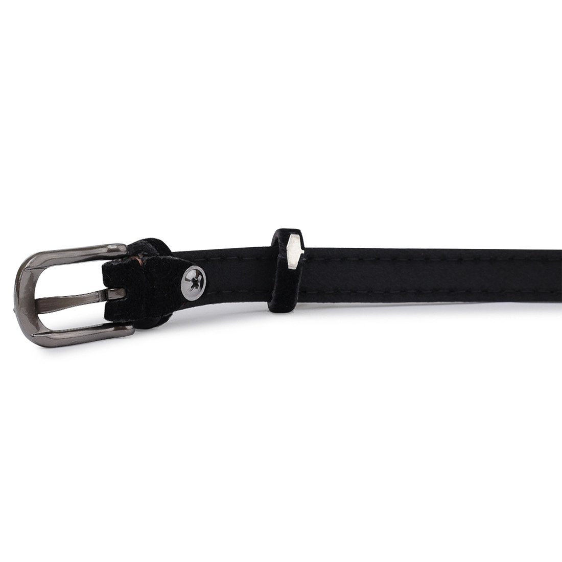 Превосходный женский ремень из замши в универсальном черном цвете, что позволяет носить его под любой стиль одежды и обуви. Материал изготовления – натуральная высококлассная кожа с высокими показателями прочности. Пряжка небольшого размера и имеет лаконичный простой дизайн, фактура изделия очень приятная на ощупь