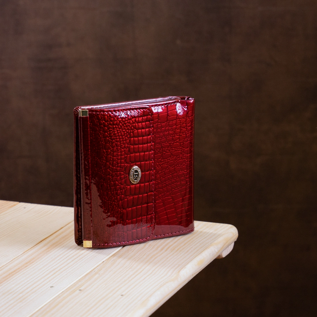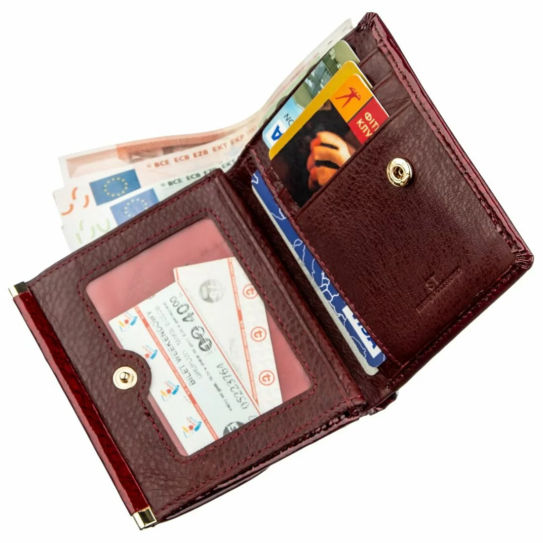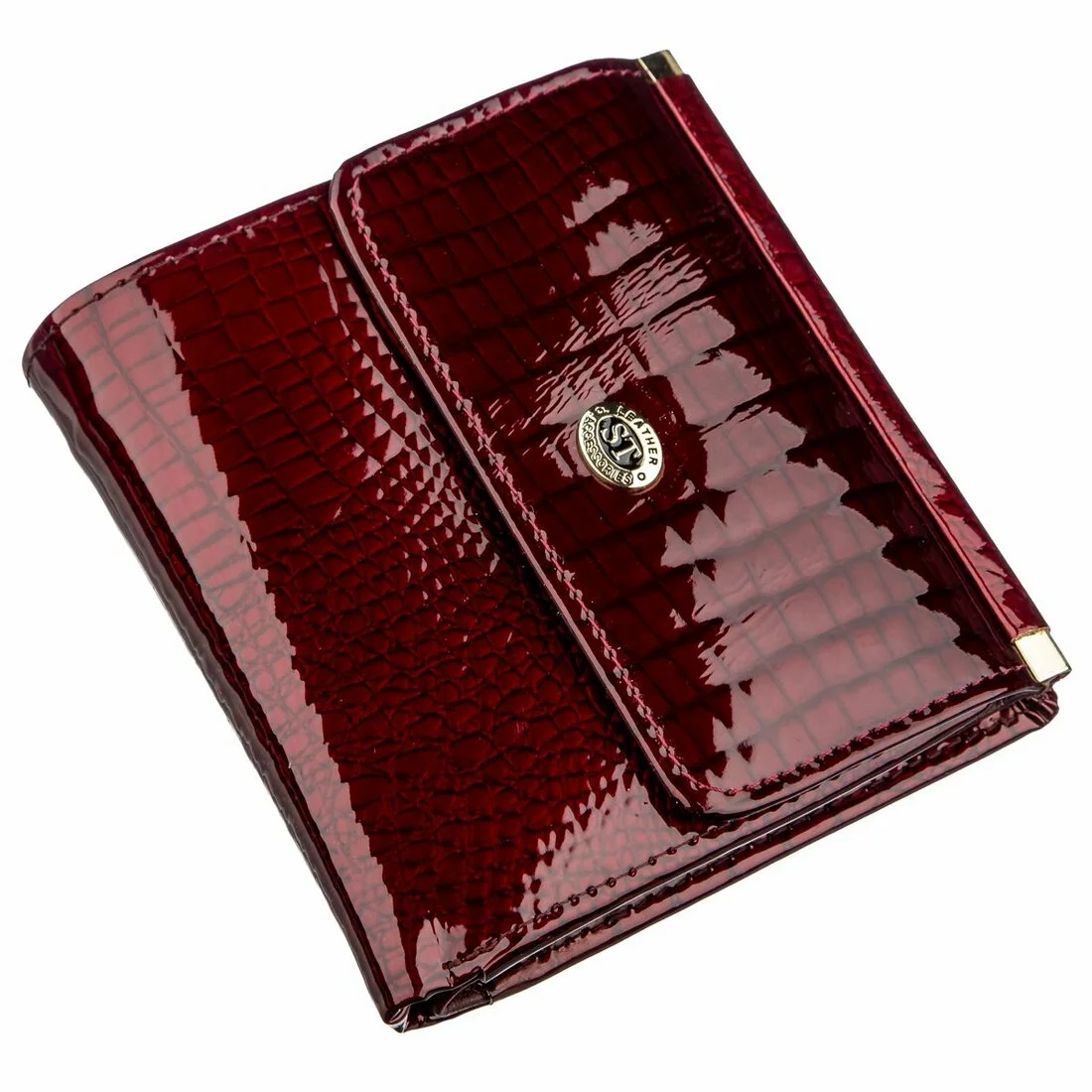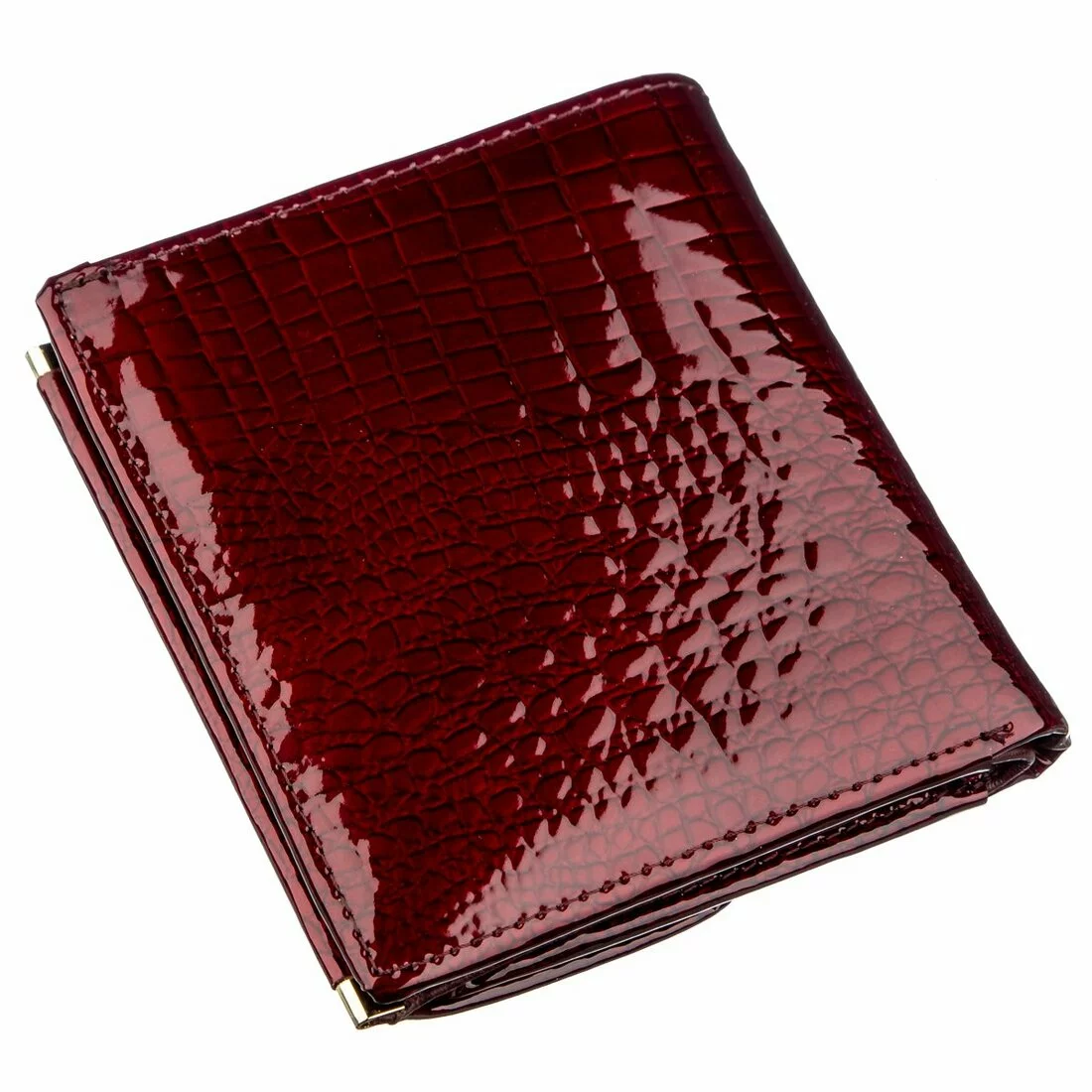 Небольшой и компактный женский кошелек с прекрасным дизайном. Материал изготовления – первоклассная натуральная кожа с мягкой и гладкой фактурой. Изделие имеет шикарный и богатый бордовый цвет, а особого шарма придает то, что аксессуар покрыт лаком. Данная модель очень стильная и просто необходима в гардеробе женщины с отличным вкусом. Наполнение кошелька достаточно практичное и удобное, несмотря на его размеры. Есть отделения для купюр и банкнот, для карт и визиток, и фото родных. Монетница предусмотрительно расположена на внешней стороне, а это способствует быстрому доступу к мелочи. Упакован кошелек в фирменную картонную коробку.