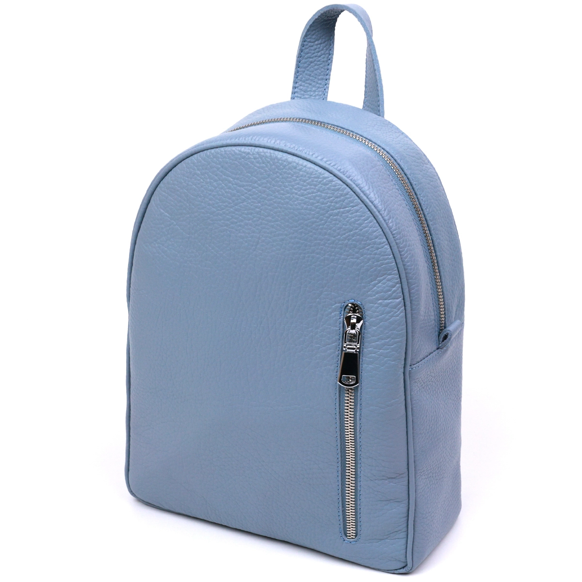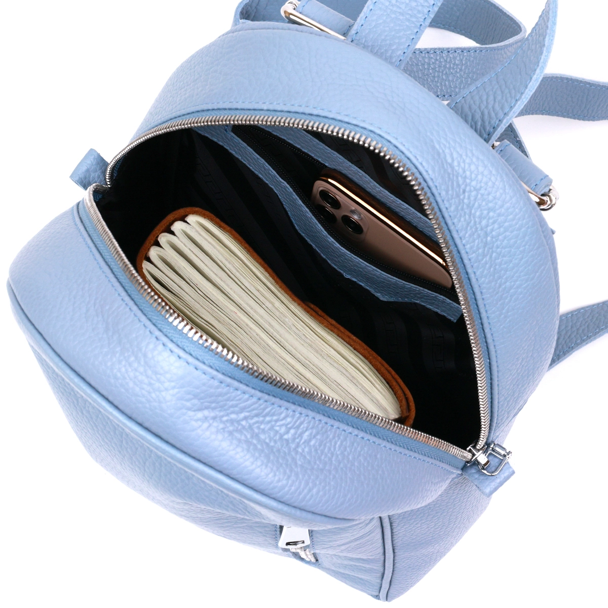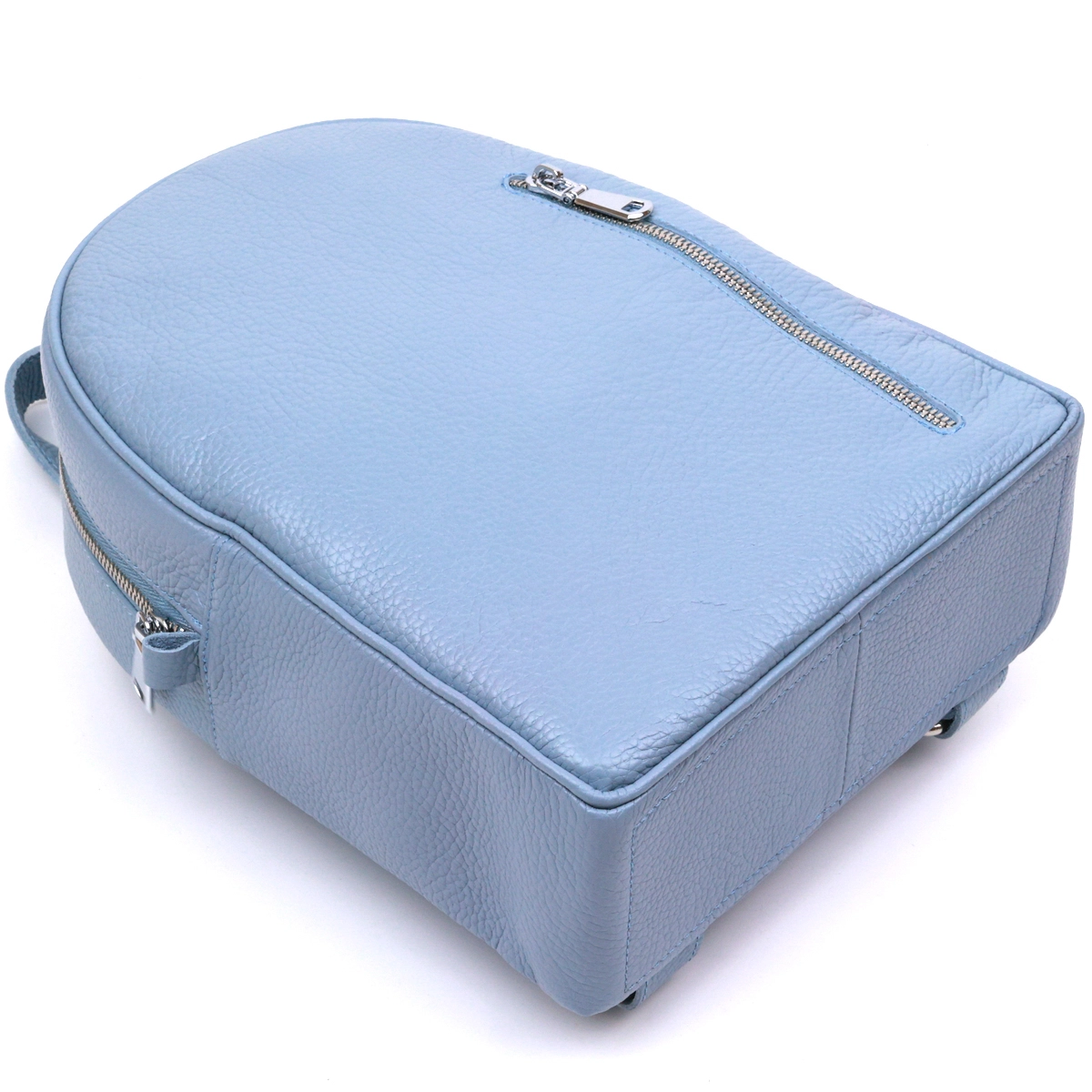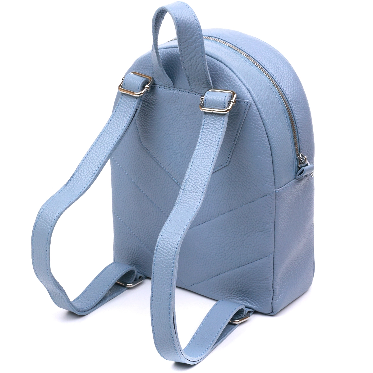 Замечательный женский рюкзак небольшого размера в практичном и стильном дизайне. Материал изготовления – натуральная кожа высокого качества с повышенной прочностью и стойкостью к износу. Цвет данной модели – бледно-голубой, что смотрится очень красиво и не вызывающе. Фактура – зернистая и очень приятная на ощупь. Шлейки и ручка для переноски выполнены также из натуральной кожи.