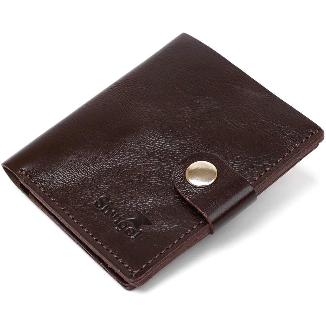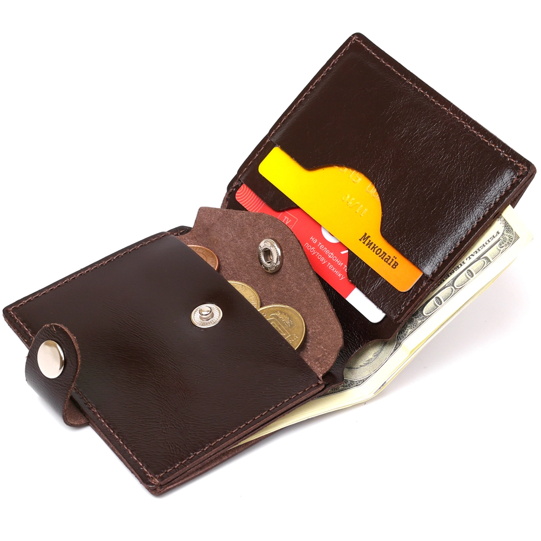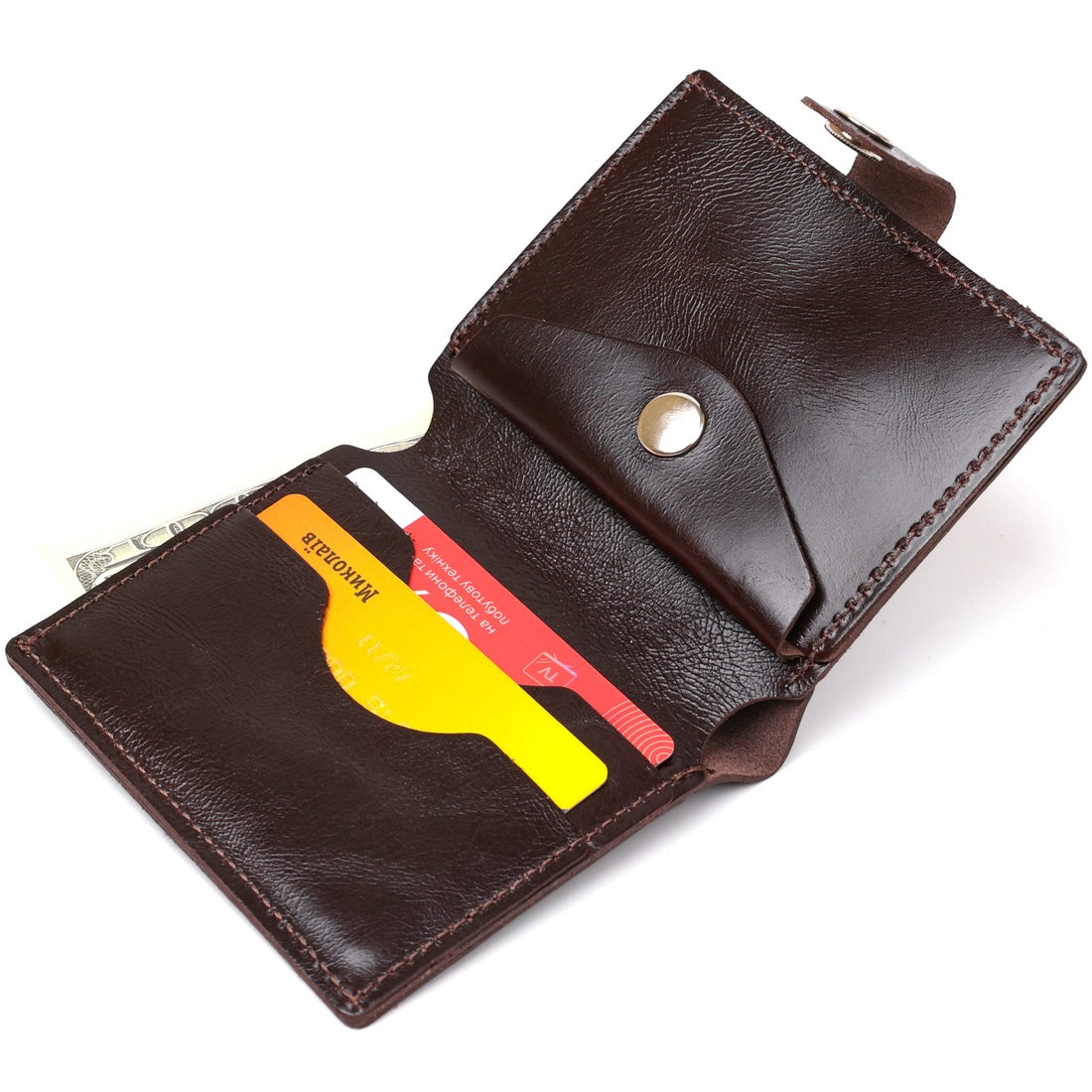 Стильное мужское портмоне от украинского производителя в сдержанном классическом дизайне. Изготовлен кошелек из натуральной кожи высокого качества и повышенной сопротивляемости к износу. Внутри есть вместительное отделение для купюр, слоты для пластиковых карточек и небольшая монетница на кнопке. Цвет аксессуара – коричневый с легким переливом, фактура – гладкая.
