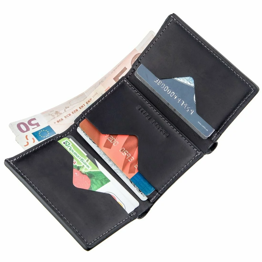 имеет одно открытое отделение для купюр и несколько фиксированных
