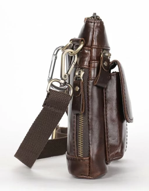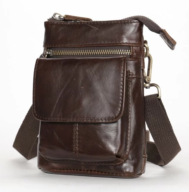 Компактная мужская сумка на каждый день. Сумка приятная на ощупь и выглядит по винтажному. Аксессуар имеет потертости, что придает ему эффекта старины. Модель дополнена крепкой золотистой фурнитурой в дизайн аксессуара. В комплекте идет съемный текстильный ремешок коричневого цвета, а также карабин для вашего удобства или вы можете прицепить на него ключи. Внутри коричневая подкладка из качественного текстиля. Сумка проносится не один год и будет идеальным подарком по любому поводу.