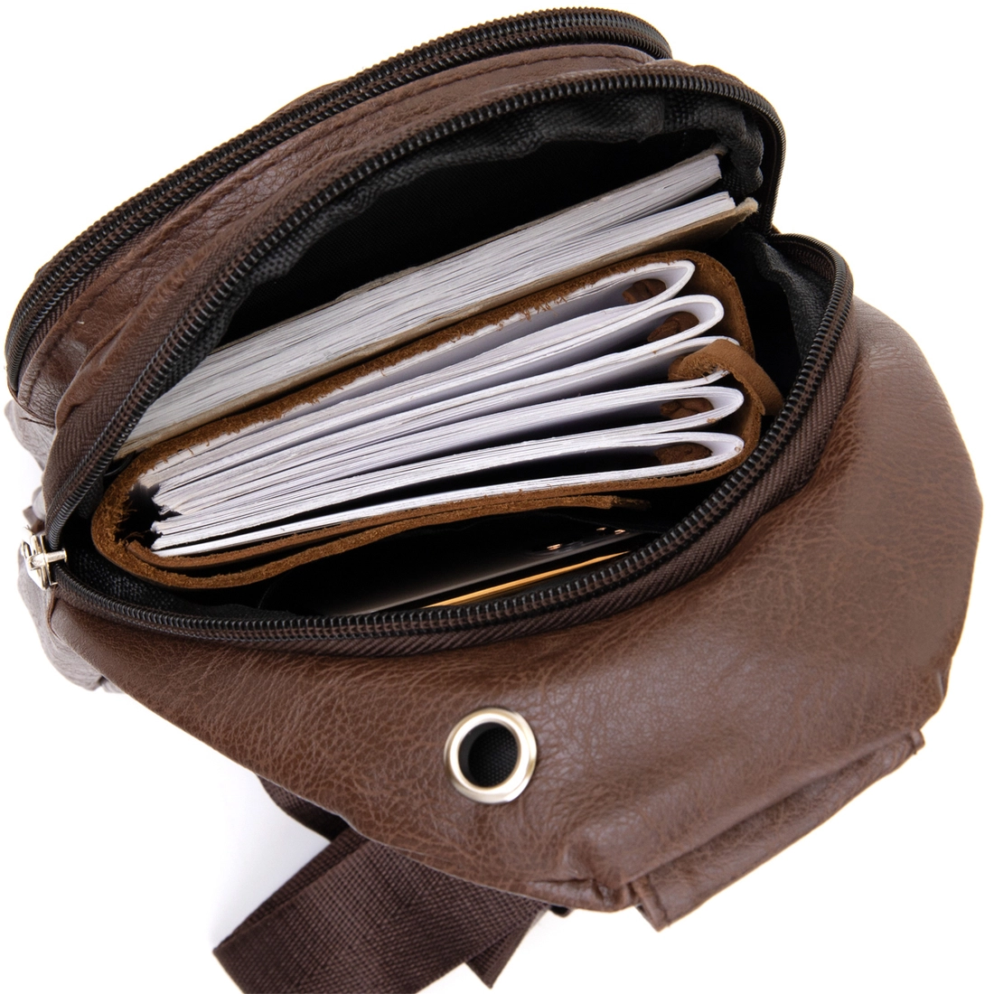 Изделие в коричневом цвете с текстильной подкладкой. Сумка через