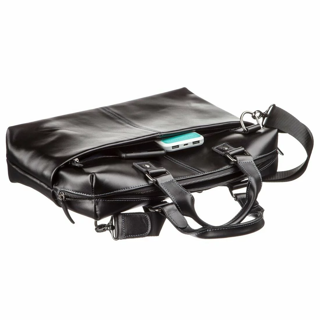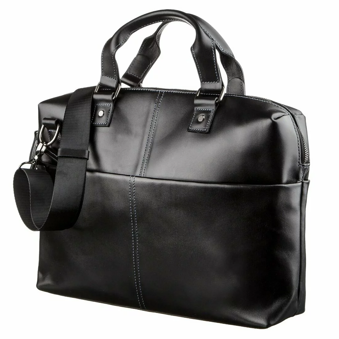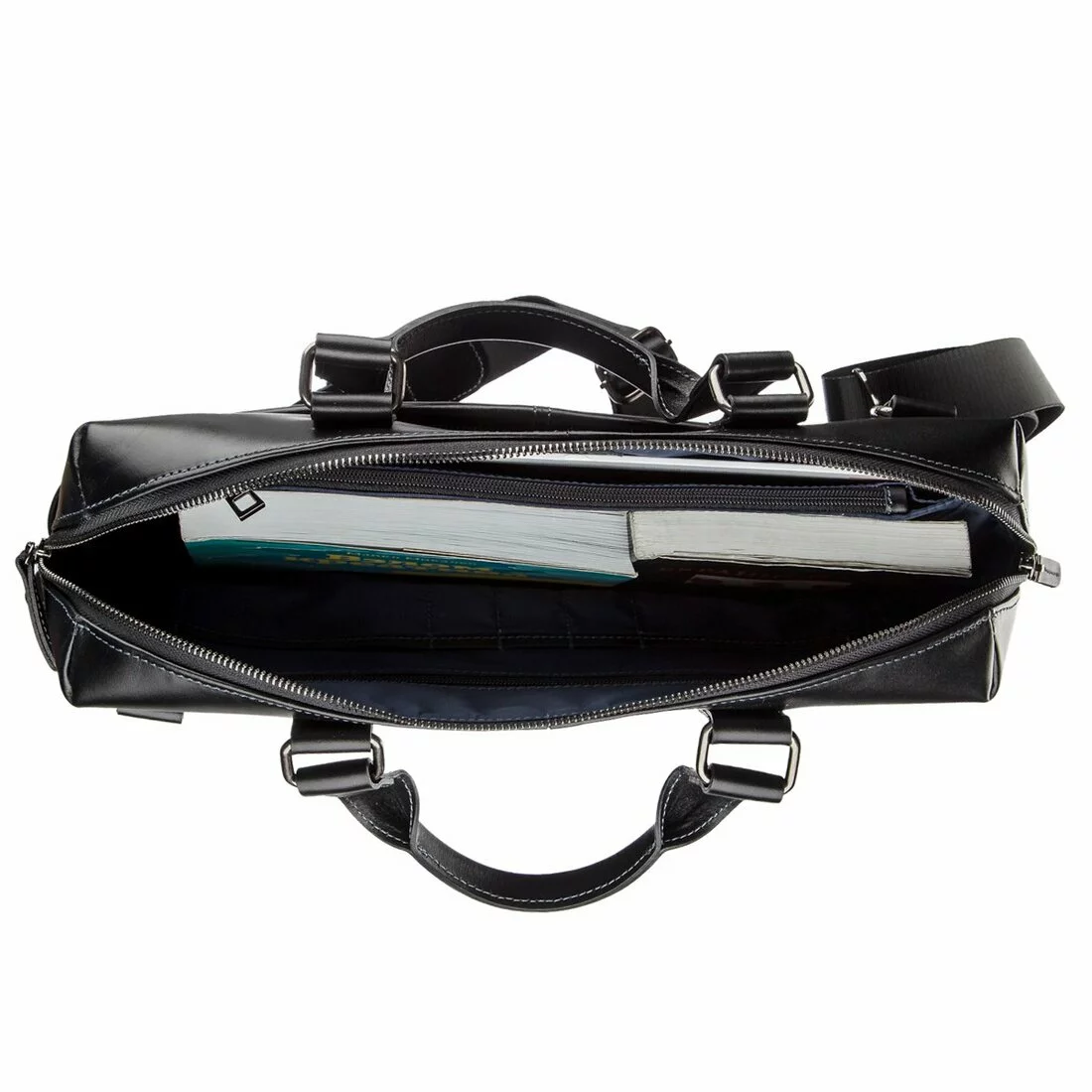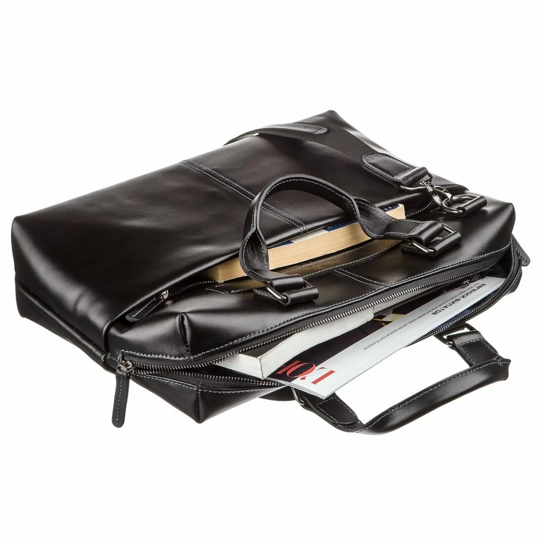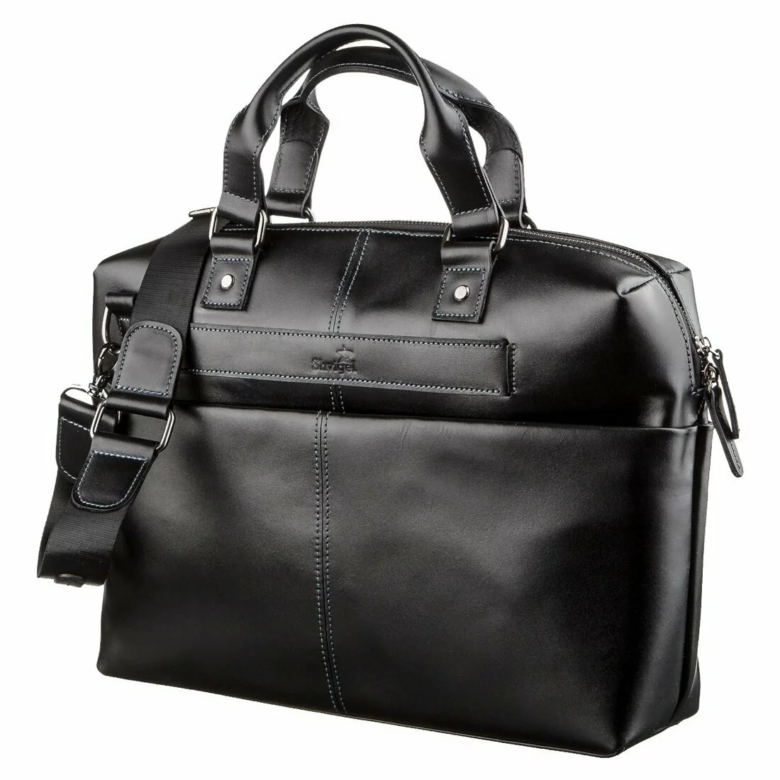 ремне из прочного текстиля и кожи или в руке за две кожаные ручки.