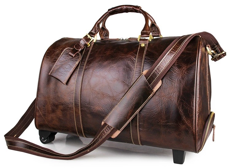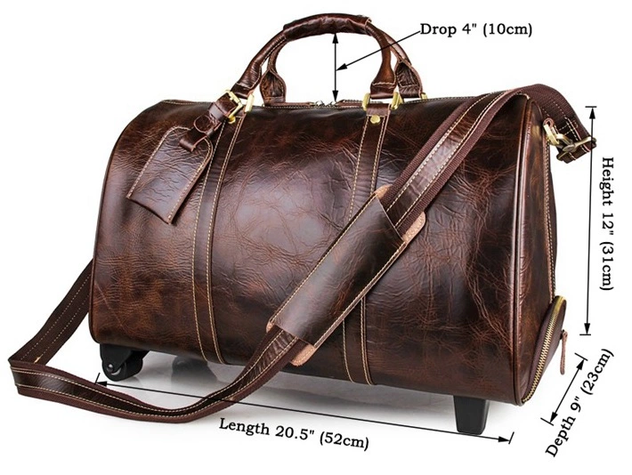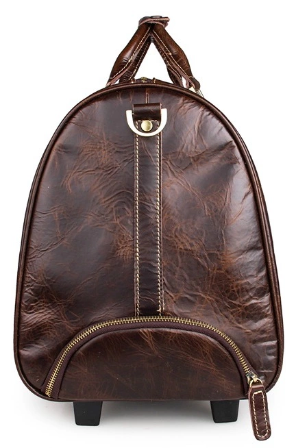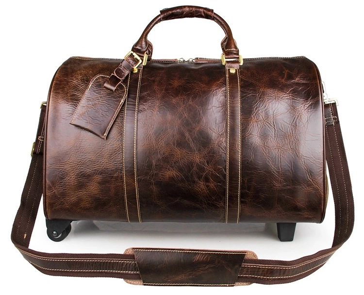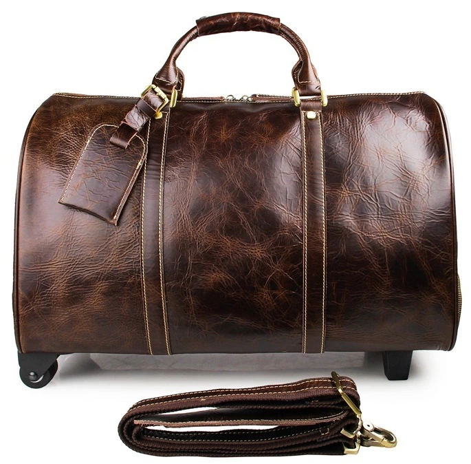 Вместительная дорожная кожаная сумка на 2-х колесах. Аксессуар выглядит презентабельно и очень стильно и дорого. Цвет фурнитуры: латунь. Сумка закрывается при помощи молнии на двух собачках. Носить данную модель можно в руке, а также через плечо. Сумка комплектуется кожаной багажной биркой, которая несомненно пригодится в путешествие. Аксессуар упакован в текстильный пылезащитный чехол белого цвета.
