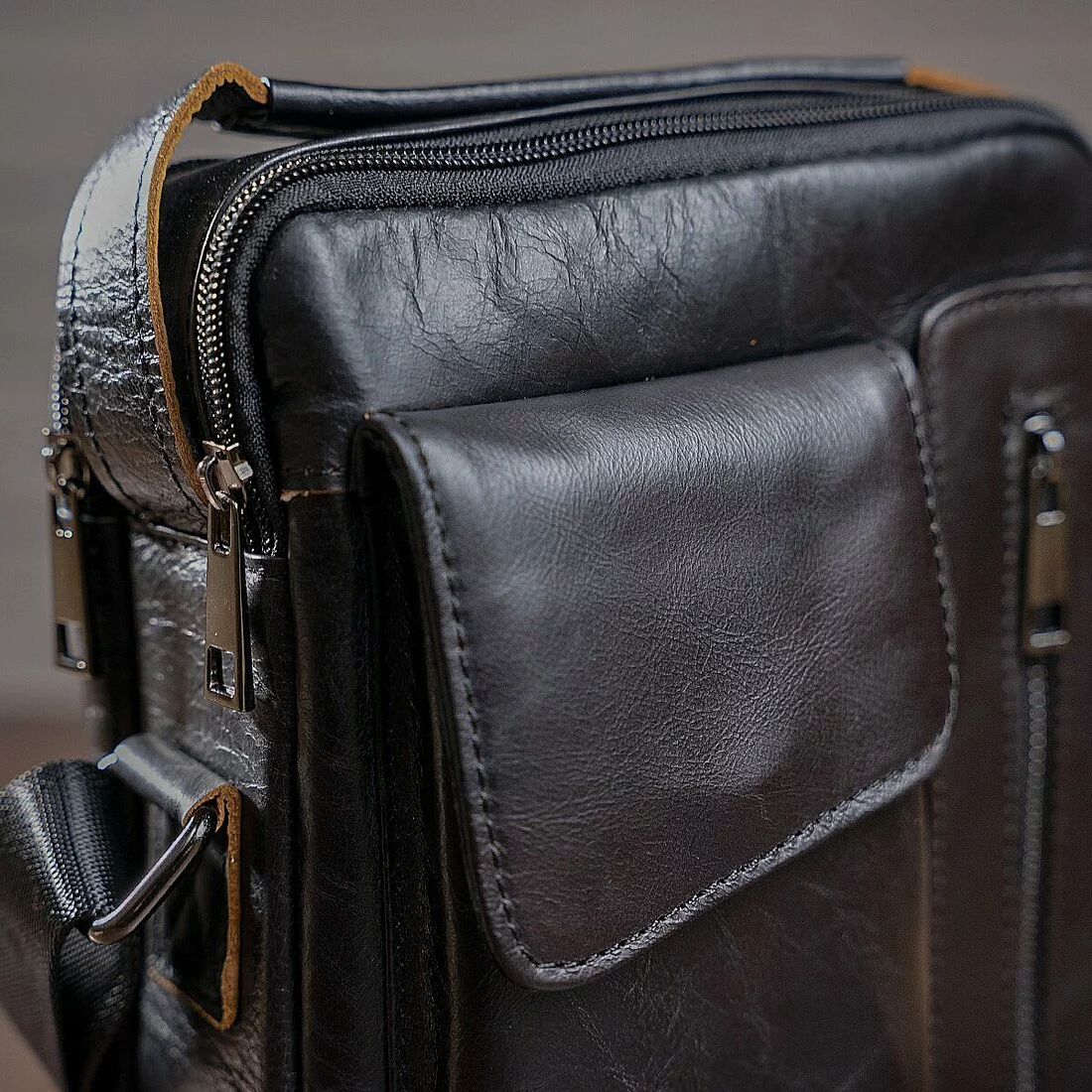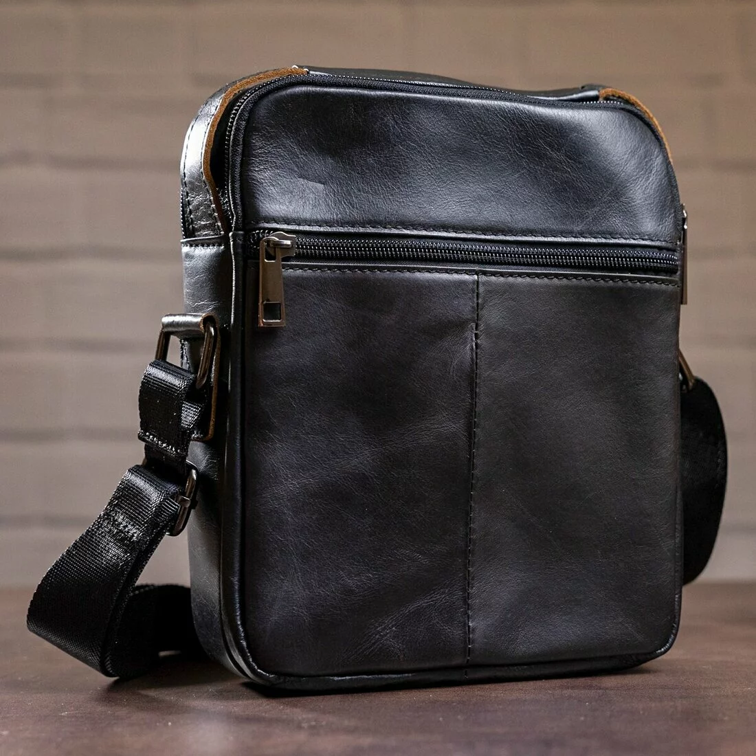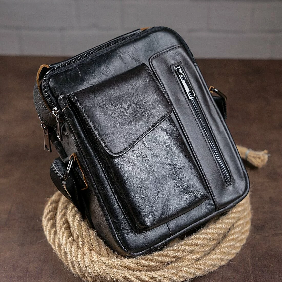 Солидная сумка для настоящих мужчин. По краям прошита черной нитью. Внутри аксессуара коричневая подкладка. Модель удобно носится на плече. Аксессуар прослужит вам очень долго. Идеальный вариант для подарка близкому человеку. Сумка упакована в тканевой мешок от пыли и износа.