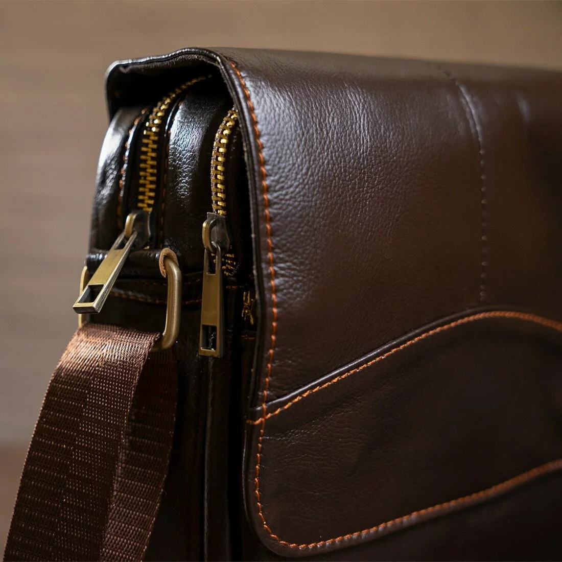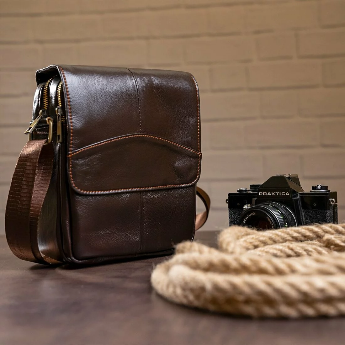 и имеет текстильную ручку на плечо. Модель прошита светлой нитью по