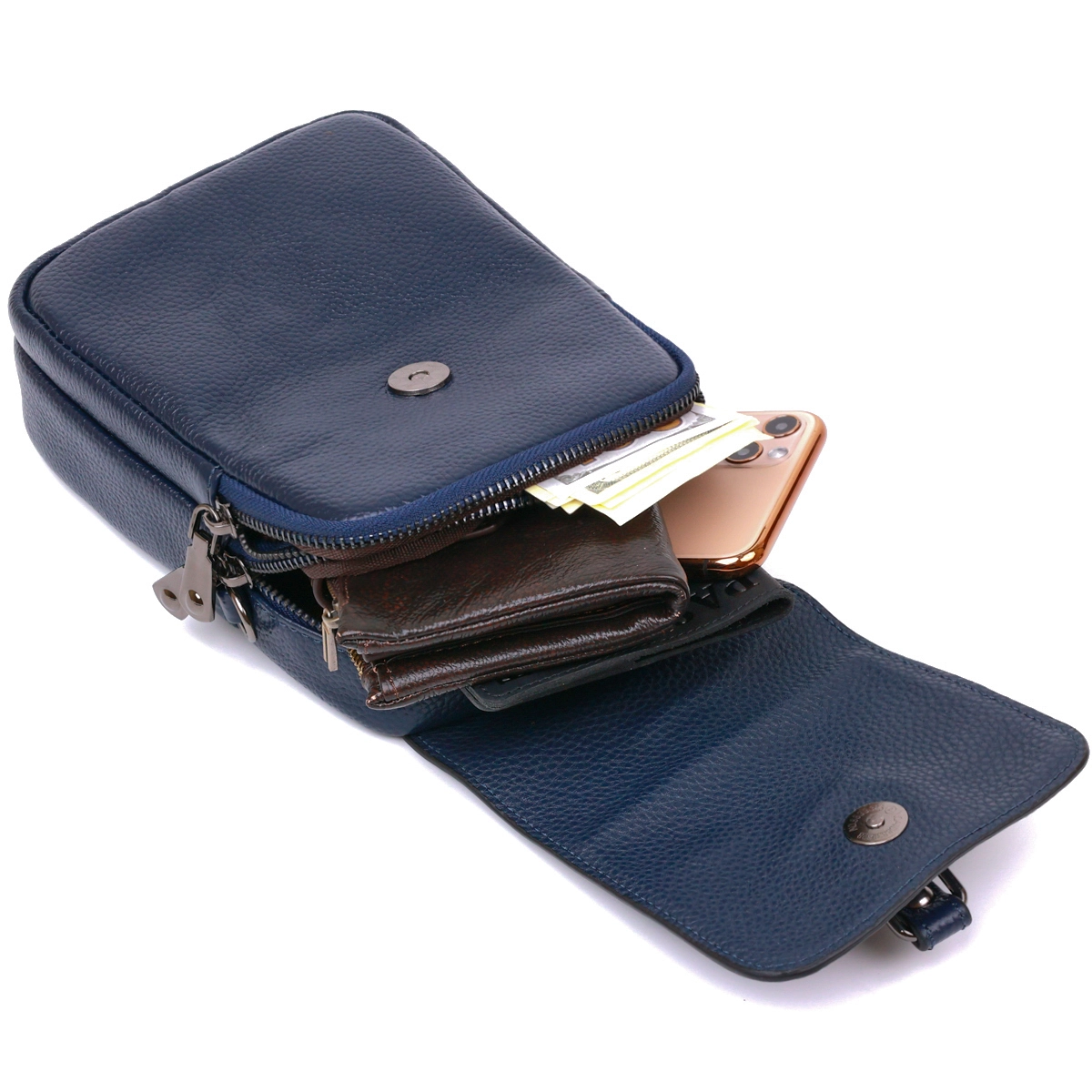 Необычная синяя сумка из качественной зернистой натуральной кожи, мягкой и приятной на ощупь. Изделие имеет достаточно отделений. Качество изделия очень высокое. Торчащие нитки отсутствуют, крепкая фурнитура и плотная подкладка. Данная модель станет прекрасным подарком для любого мужчины. В комплекте идет пылезащитный чехол.
