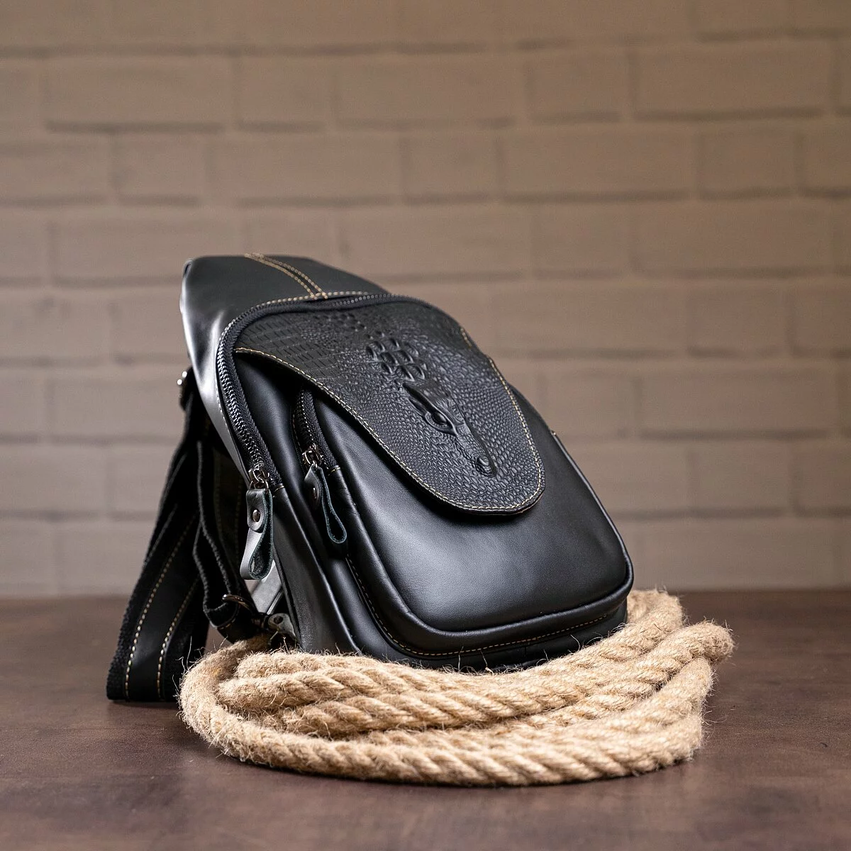 на плече черного цвета с кожаной вставкой. Особенностью такой