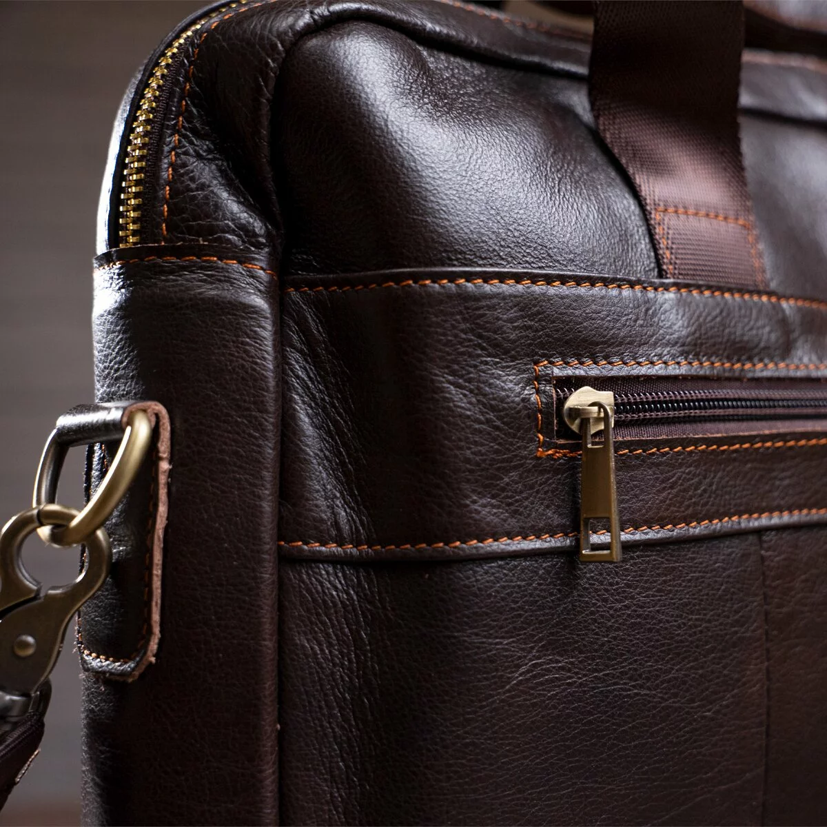 Солидная сумка для встреч, чтоб носить с собой ноутбук и документы. Аксессуар дополнен золотистой фурнитурой и прошит рыжей нитью. Модель можно носить как за ручки с кожаными вставками, так и с помощью текстильного ремешка на плечо. Внутри крепкая текстильная подкладка коричневого цвета. В уходе модель не прихотливая и долго носится. Будет идеальным вариантом для подарка близкому человеку. Аксессуар упакован в тканевый мешок.