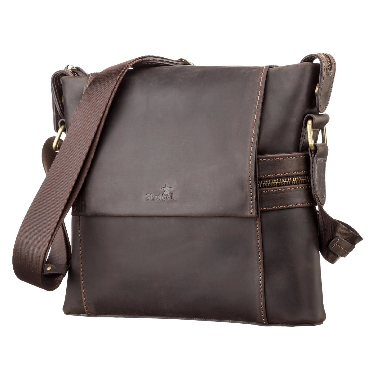 через плечо, среднего размера с клапаном. Вместительная и удобная.