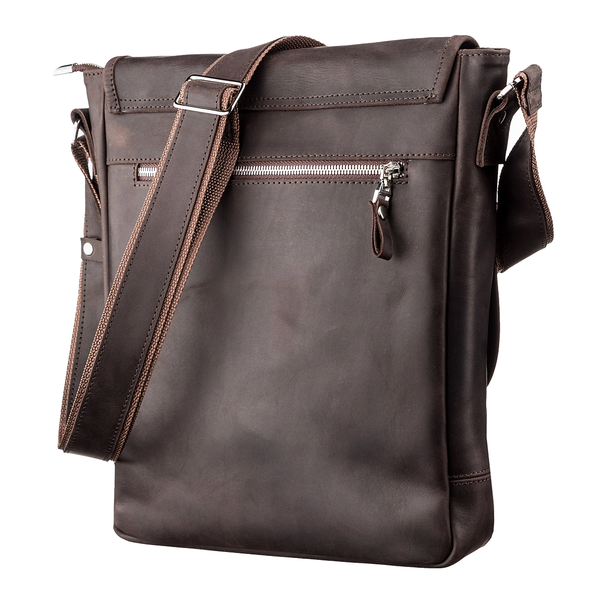 Удобная мужская сумка из винтажной кожи высокого качества. Изделие выполнено из кожи коричневого цвета. Кожа добротная, приятная на ощупь. Цвет фурнитуры: серебро. Сумка аккуратно прошита сверхпрочной нитью коричневого цвета. На задней внешней стороне аксессуара расположено отделение на молнии. Данная модель носиться через плечо. Плечевой ремень выполнен в комбинации натуральной кожи и прочного текстильного материала. Сумка закрывается при помощи клапана и 2-х кожаных хлястиков на магнитных кнопках, а также молнией. Под клапаном находится вместительный накладной карман.