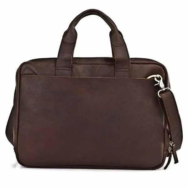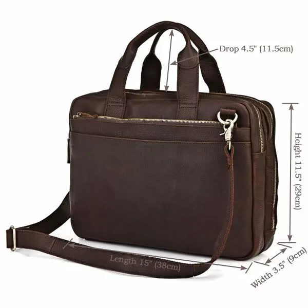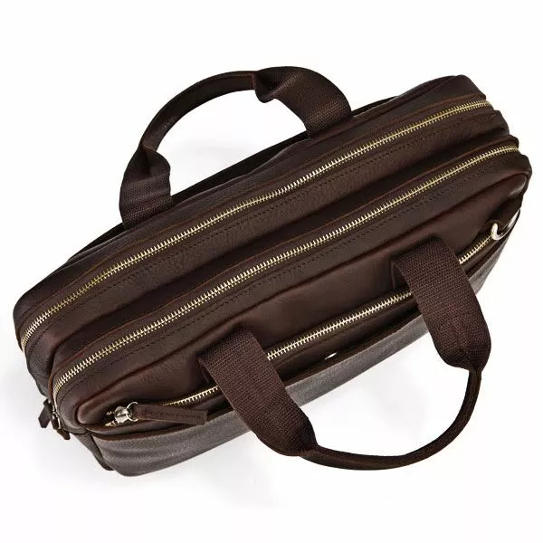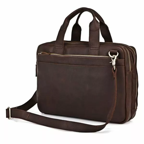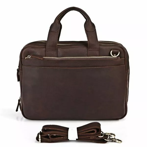 Отличная кожаная сумка коричневого цвета. Сумка идеально помещают ноутбук с диагональю 15 дюймов. Два независимых отделения на молниях позволяют разместить в одном ноутбук, а во втором все остальное. Данная мужская кожаная сумка под ноутбук рассчитана на повседневное использование и сможет стать верным спутником делового мужчины.