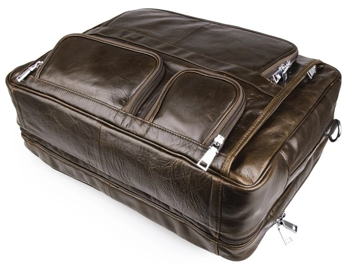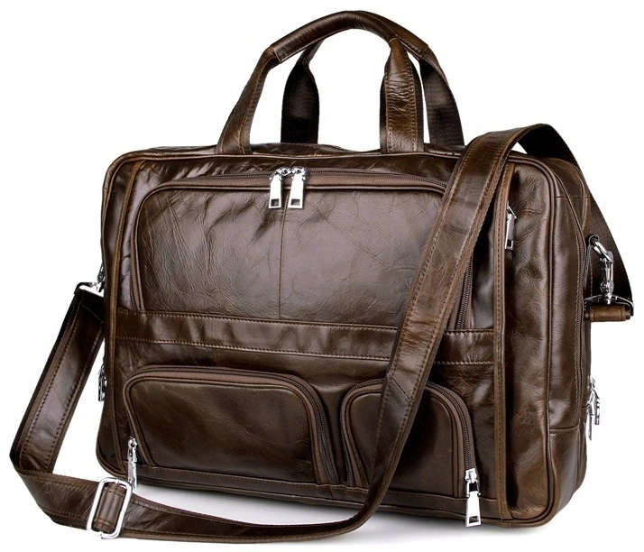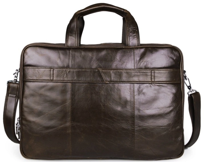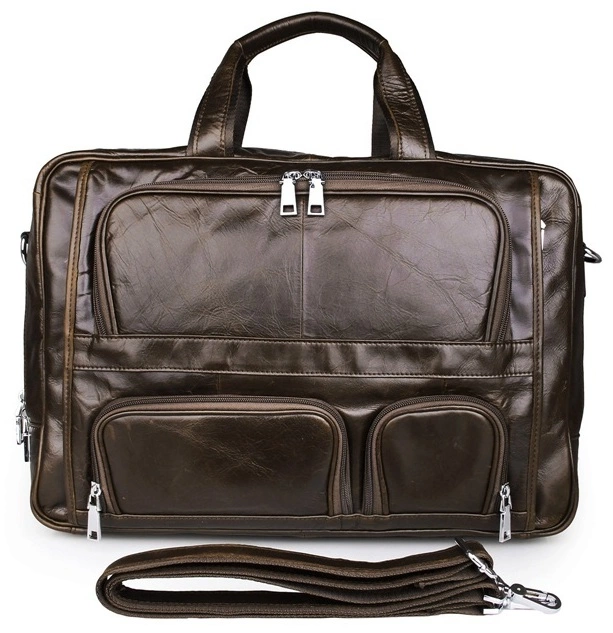 Большая мужская кожаная сумка с множеством отделений и карманов. Аксессуар можно переносить при помощи удобных ручек в руке, а также через плечо. На задней внешней стороне изделия расположена ручка с помощью, которой сумка при необходимости крепиться к чемодану. Цвет фурнитуры: серебро. Аксессуар можно использовать для носки папки с документами и ноутбука, а также как сумку для спортзала.