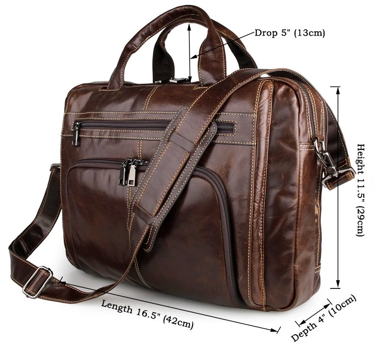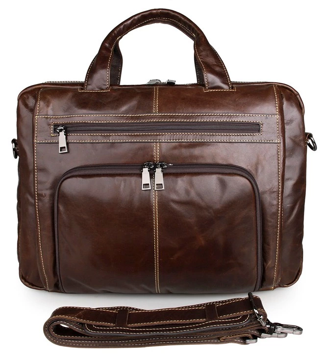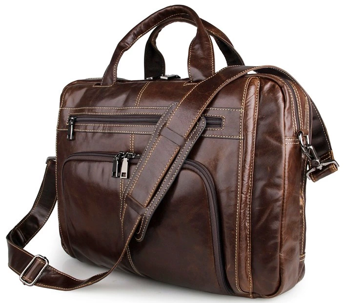 Многофункциональная мужская кожаная сумка для ноутбука 15.6 дюйма. Аксессуар обладает очень красивым коричневым цветом с легким блеском. Цвет фурнитуры: темное серебро. На лицевой стороне расположены 2 отделения на молнии. На задней стенке находится 1-но отделение на молнии. Аксессуар прошит сверхпрочной нитью в светлых тонах. Сумка упакована в текстильный пылезащитный мешочек.
