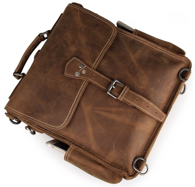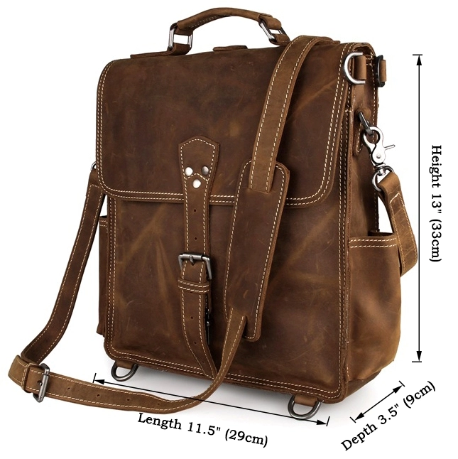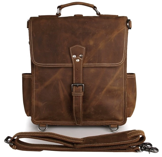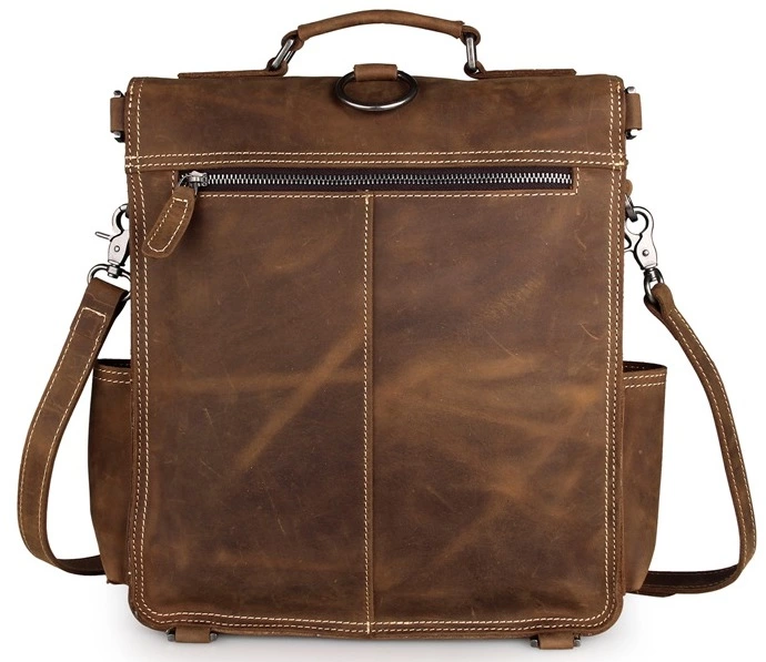 Отличная кожаная сумка, которая может использоваться как мужчинам, так и женщинами. Особенностью данной модели является то, что ее можно носить в руке, через плечо, а также использовать как рюкзак. Аксессуар выполнен из толстой, дорогостоящей винтажной кожи. Цвет фурнитуры: серебро. Сумка закрывается клапаном на защелке, а также молнией. На задней внешней стороне находится отделение на молнии. На боковых гранях аксессуара расположено по одному накладному карману. Сумка поставляется в текстильном пылезащитном чехле.