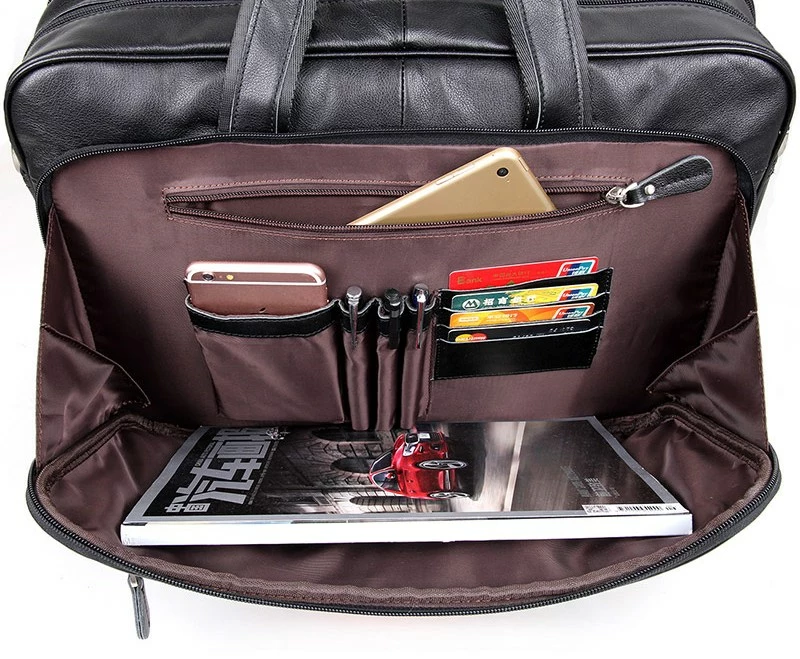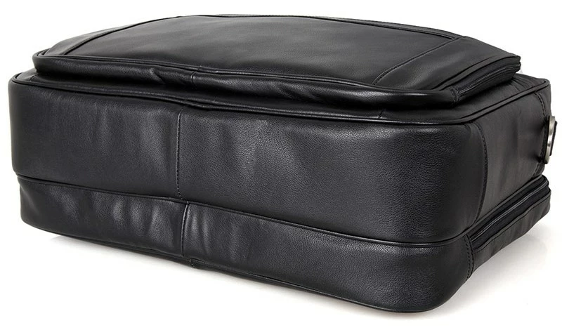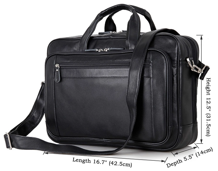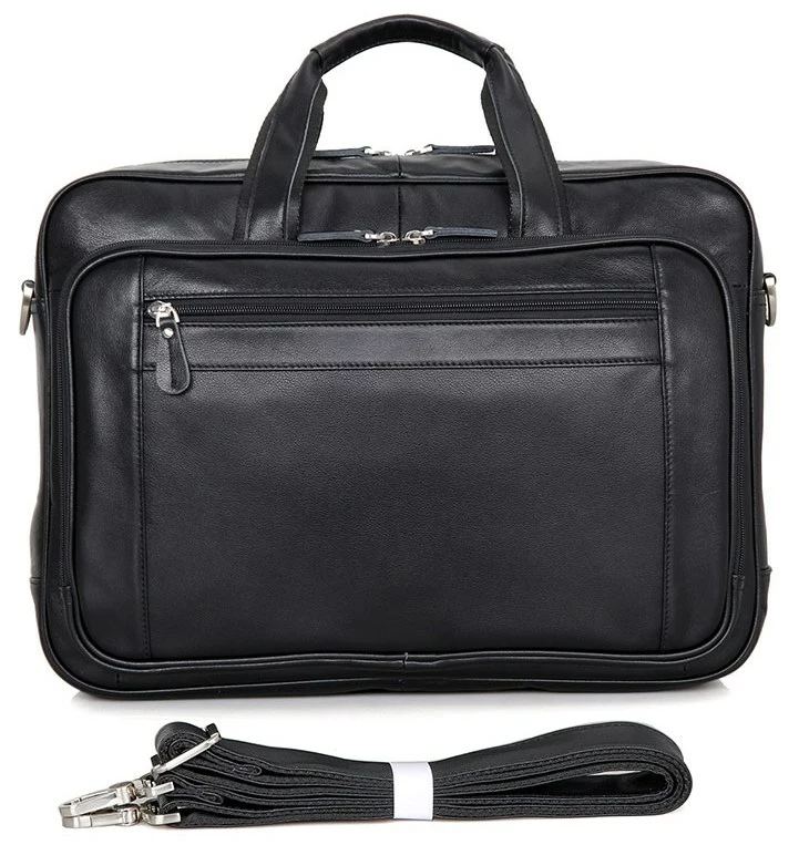 Элитная мужская сумка для ноутбука до 17-ти дюймов. Аксессуар выполнен из натуральной высококачественной кожи черного цвета. Цвет фурнитуры: серебро. Переносить данную модель можно в руке, или через плечо (в комплекте съемный, регулируемый плечевой ремень). На лицевой стороне расположен потайной карман на молнии, а также огромное отделение на молнии в котором Вы найдете: