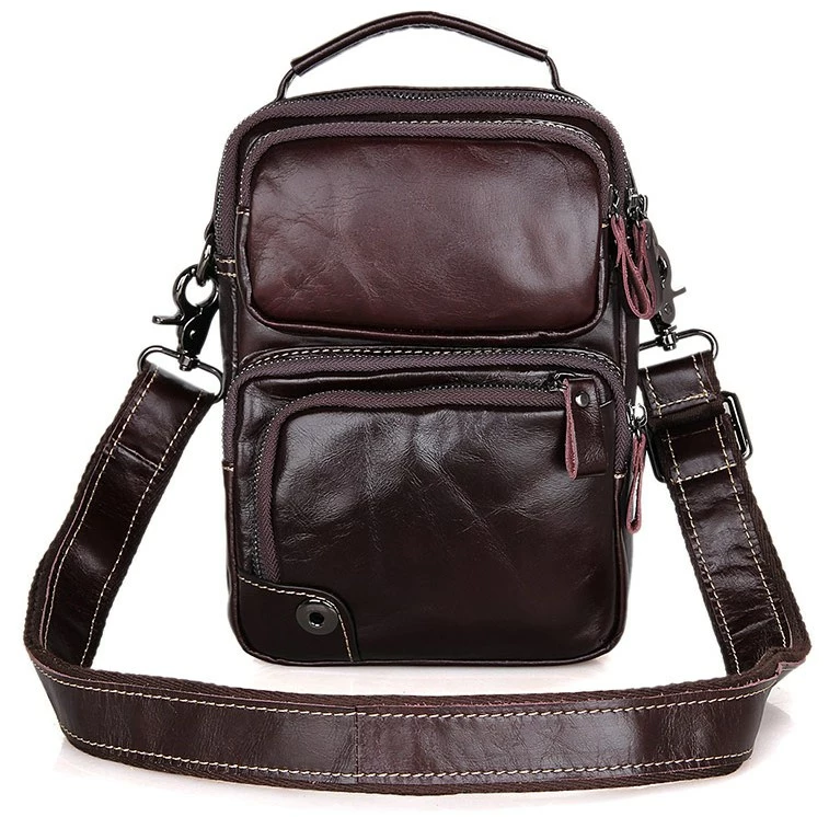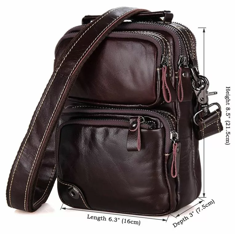 Современная мужская кожаная сумка небольших размеров. Цвет фурнитуры: темное серебро. Несмотря на свои компактные размеры, данная модель достаточно вместительна и функциональна. На лицевой стороне расположено три накладных кармана на молнии. На задней внешней стороне находится отделение на молнии.