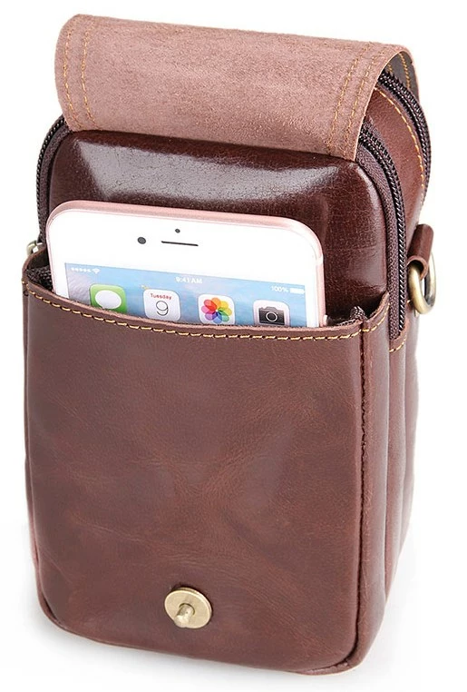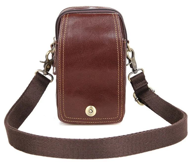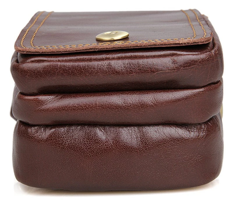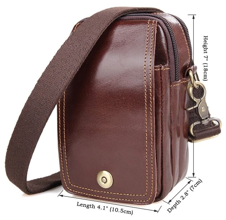 Надежная сумка небольших размеров. Аксессуар выполнен из натуральной кожи высокого качества. Цвет фурнитуры: латунь. Сумка аккуратно прошита светло-коричневой нитью. Под кожаным клапаном расположен накладной карман для быстрого доступа. Сумку можно переносить: через плечо, на поясном ремне, а также цеплять при помощи карабина. Аксессуар имеет два основных отделения, которые закрываются молниями. Сумка упакована в текстильный пылезащитный чехол белого цвета.