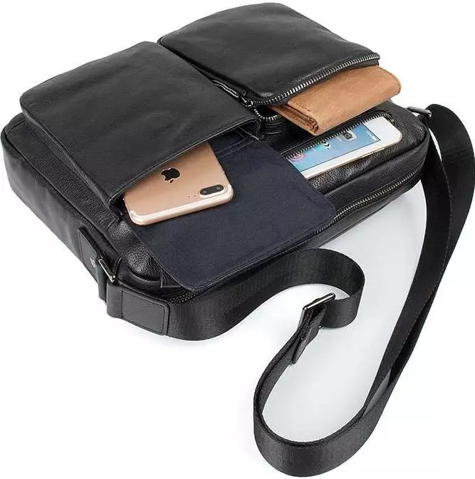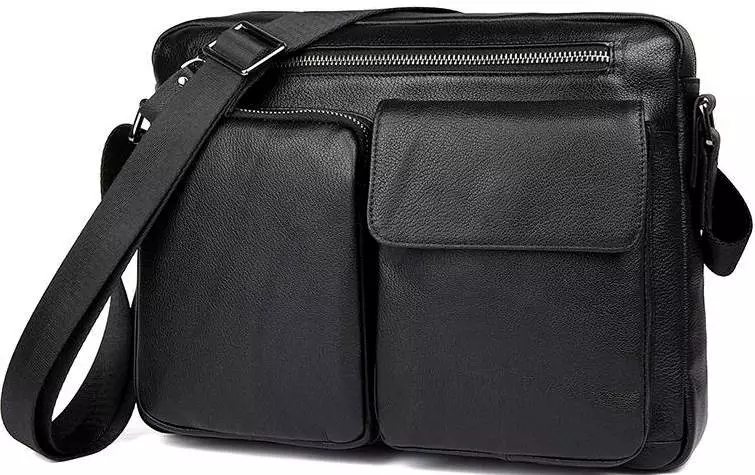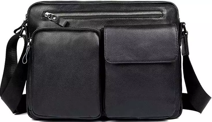 Повседневная мужская кожаная сумка через плече, из высококачественной натуральной зернистой кожи. В изделии множество карманов и отделений, что позволяет поместить в него максимум нужных вещей. Цвет фурнитуры: серебро. Изделие упаковано в текстильный пылезащитный чехол белого цвета.
