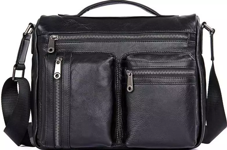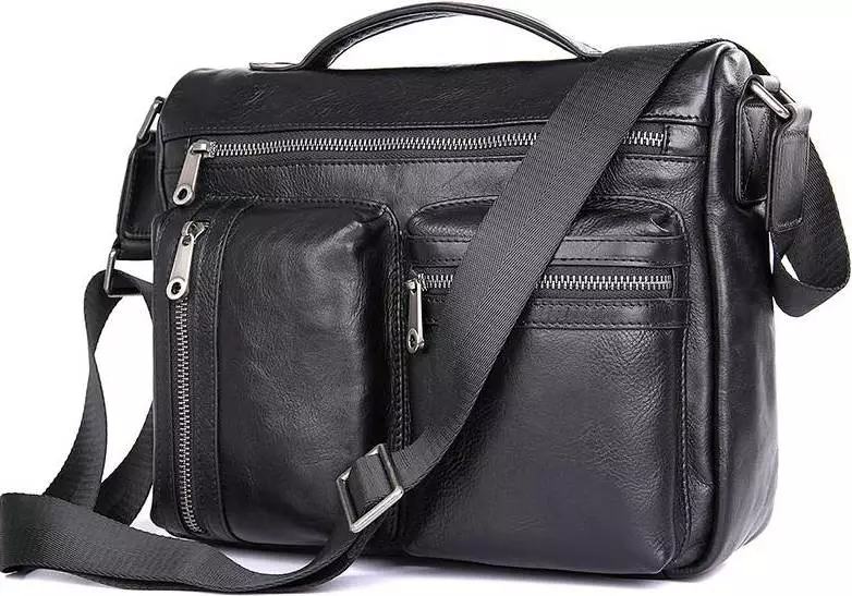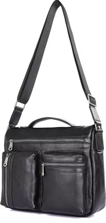 Вместительная кожаная сумка черного цвета, из натуральной высококачественной кожи. Цвет фурнитуры: темное серебро. На лицевой стороне расположены два накладныхм кармана на молниях. На задней внешней стороне данной модели находится один горизонтальный карман на молнии. Аксессуар имеет одно основное отделение на молнии, в котором находится один скрытый карман на змейке и два небольших накладных кармана. Носится данный аксессуар в руке при помощи надежной кожаной ручки и через плечо при помощи регулируемого текстильного ремня. Подкладка выполнена из прочного текстильного материала черного цвета. Аксессуар поставляется в текстильном пылезащитном чехле белого цвета.