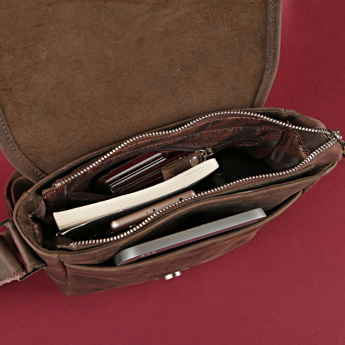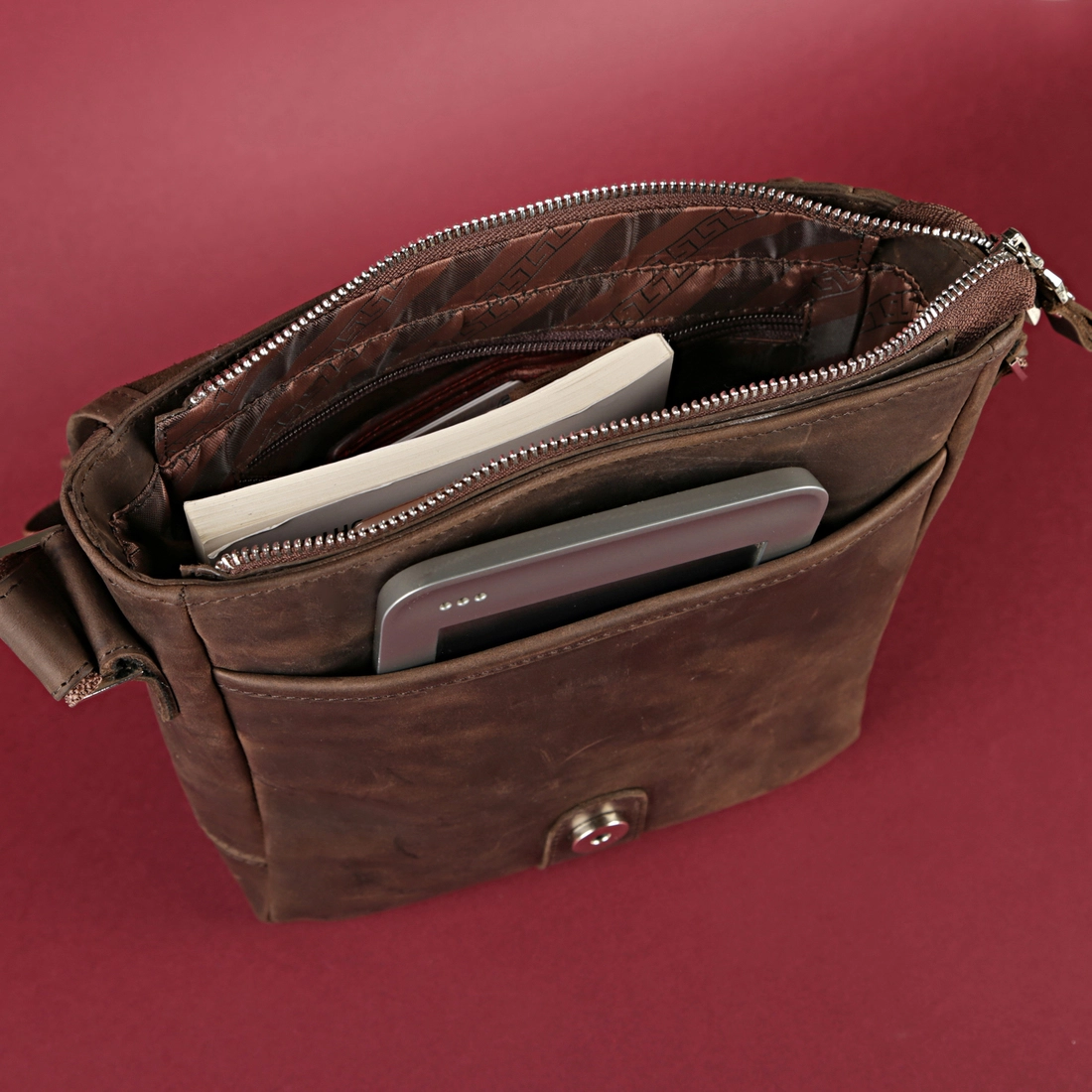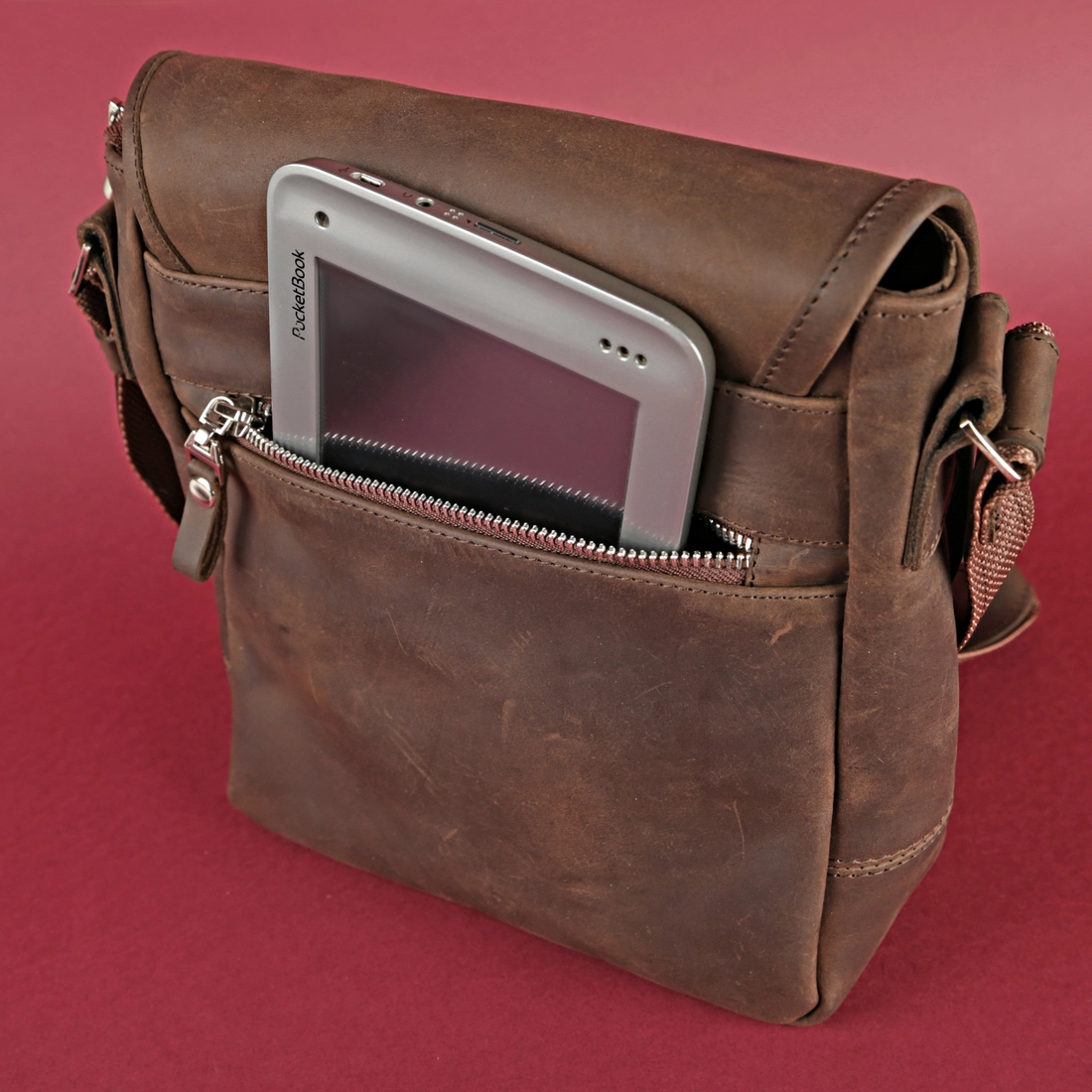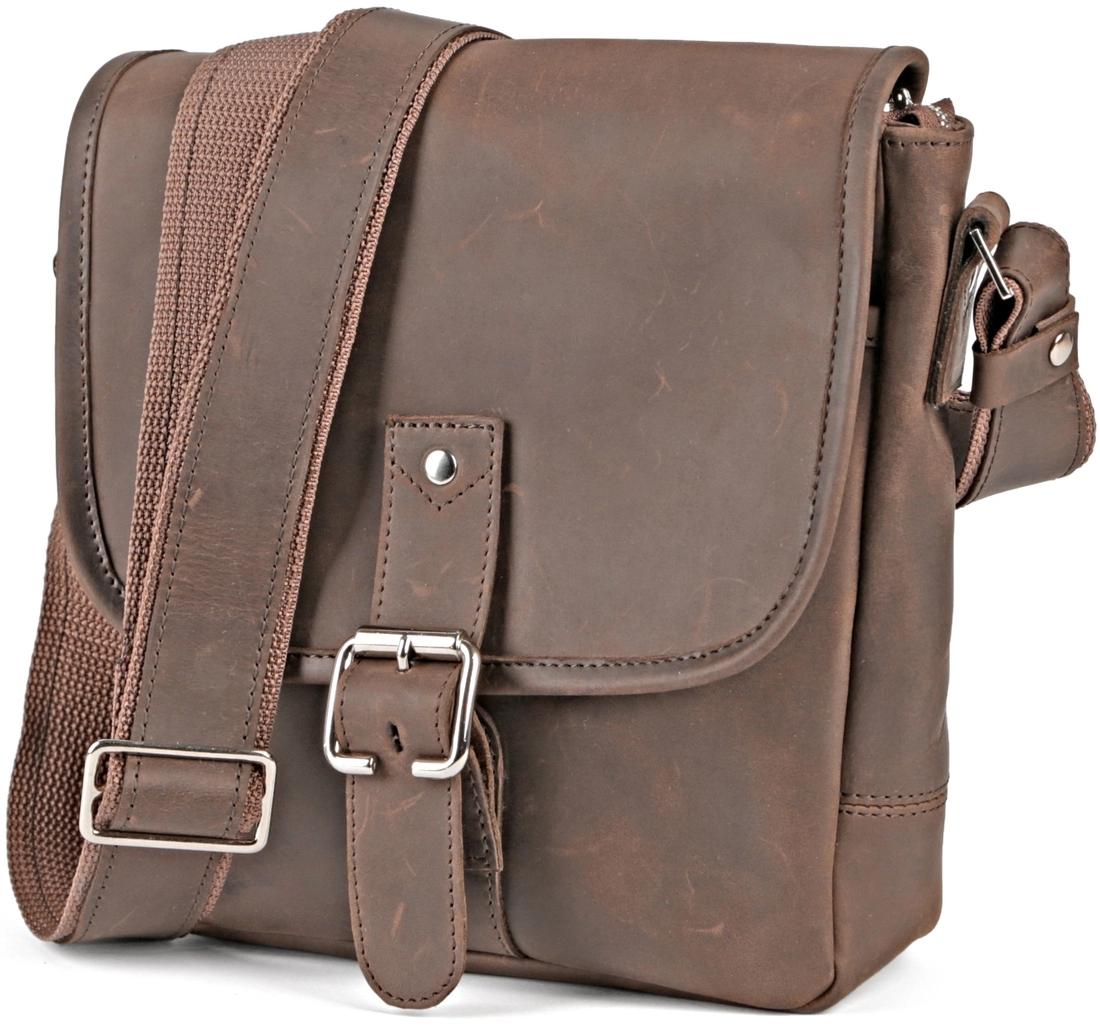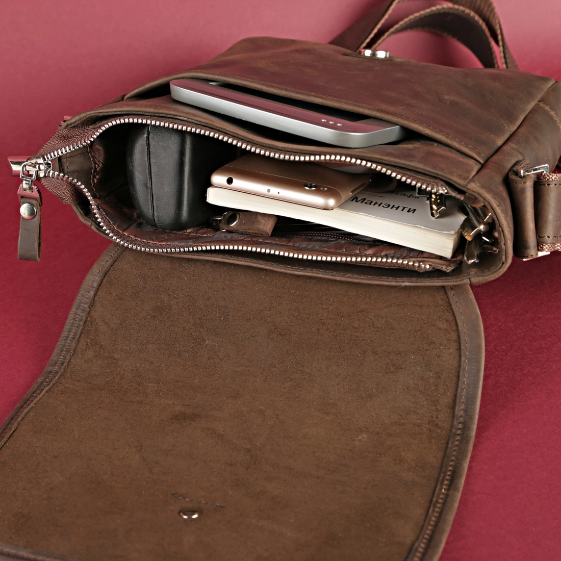 Современная мужская сумка через плечо. Аксессуар выполнен из натуральной высококачественной винтажной кожи. Цвет фурнитуры: серебро. Сумка надежно прошита прочной нитью. Швы - ровные, аккуратные.