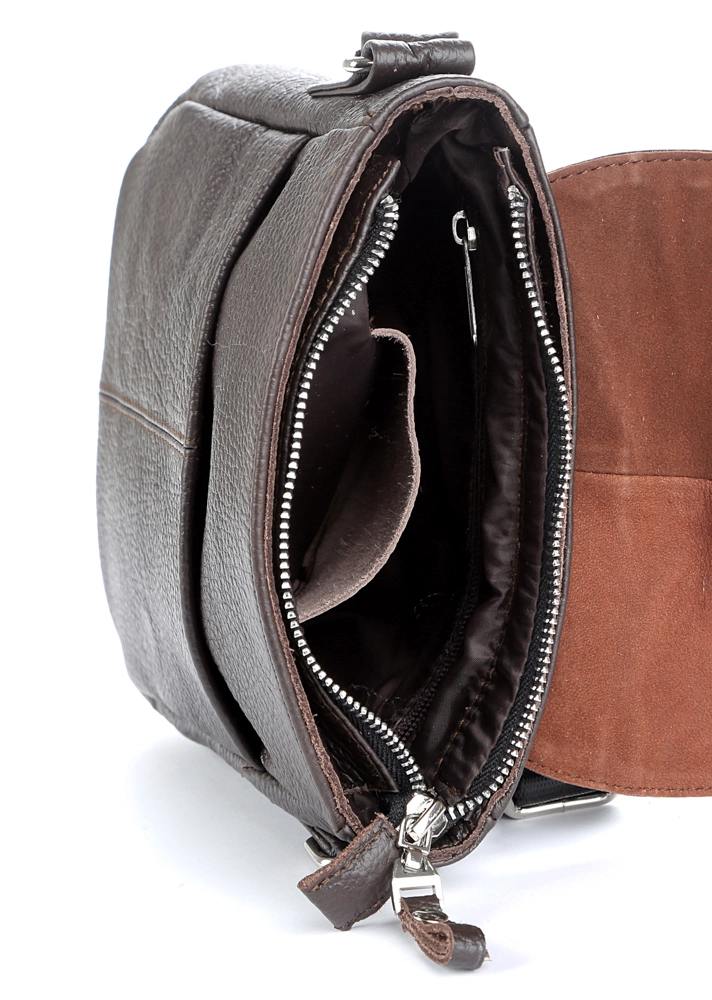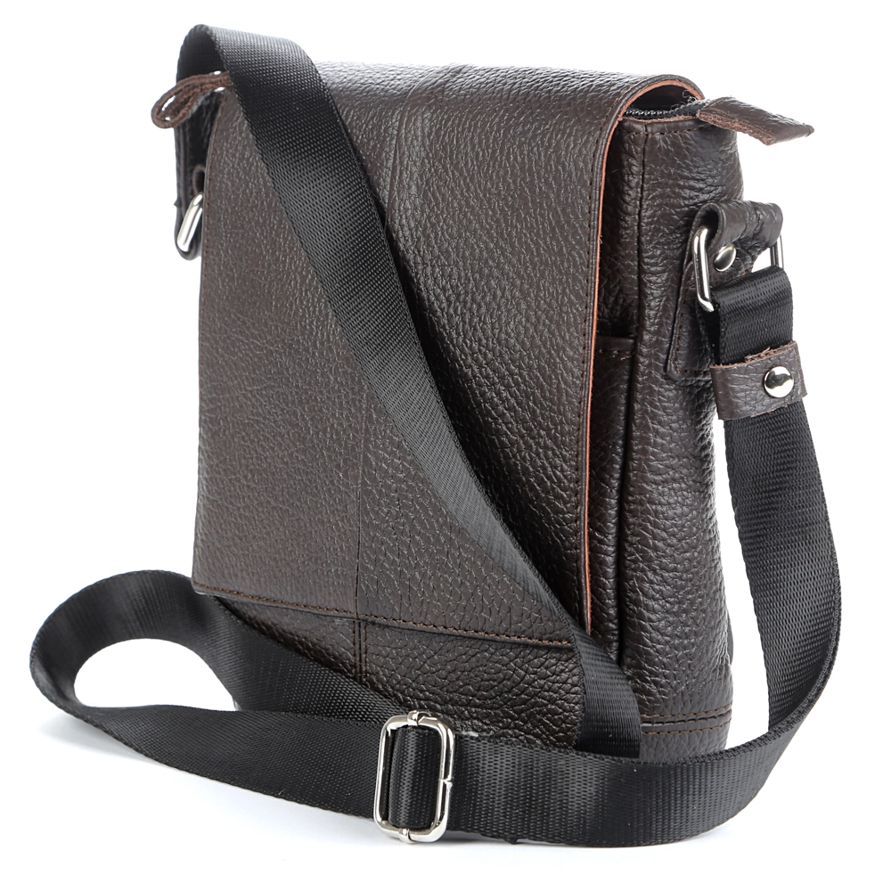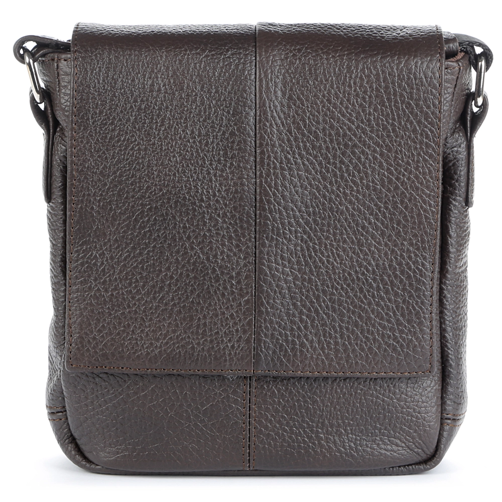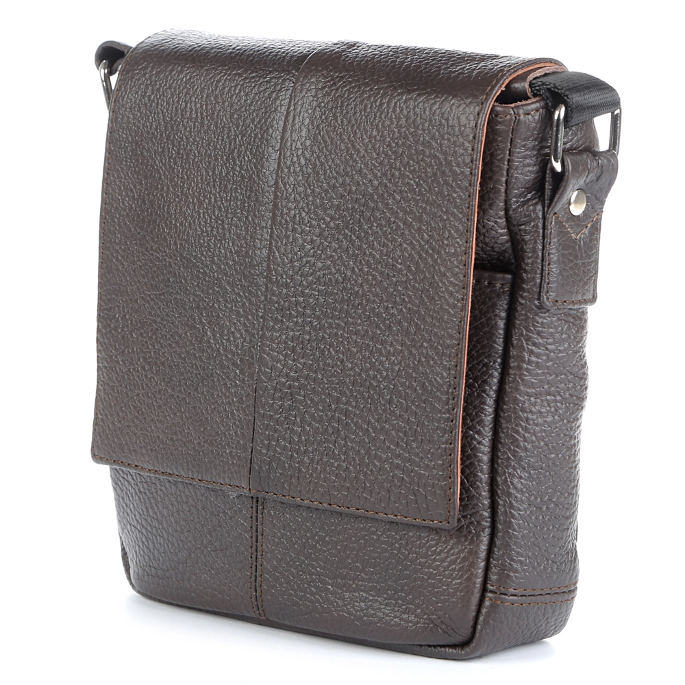 Эксклюзивная мужская кожаная сумка темно-коричневого цвета. Аксессуар аккуратно прошит сверхпрочной нитью. Цвет фурнитуры: серебро. Сумка носиться через плечо при помощи текстильного регулируемого плечевого ремня. На задней внешней стороне расположен карман на молнии. Сумка закрывается при помощи клапана на двух скрытых магнитах и молнией. Под клапаном находится накладной карман.