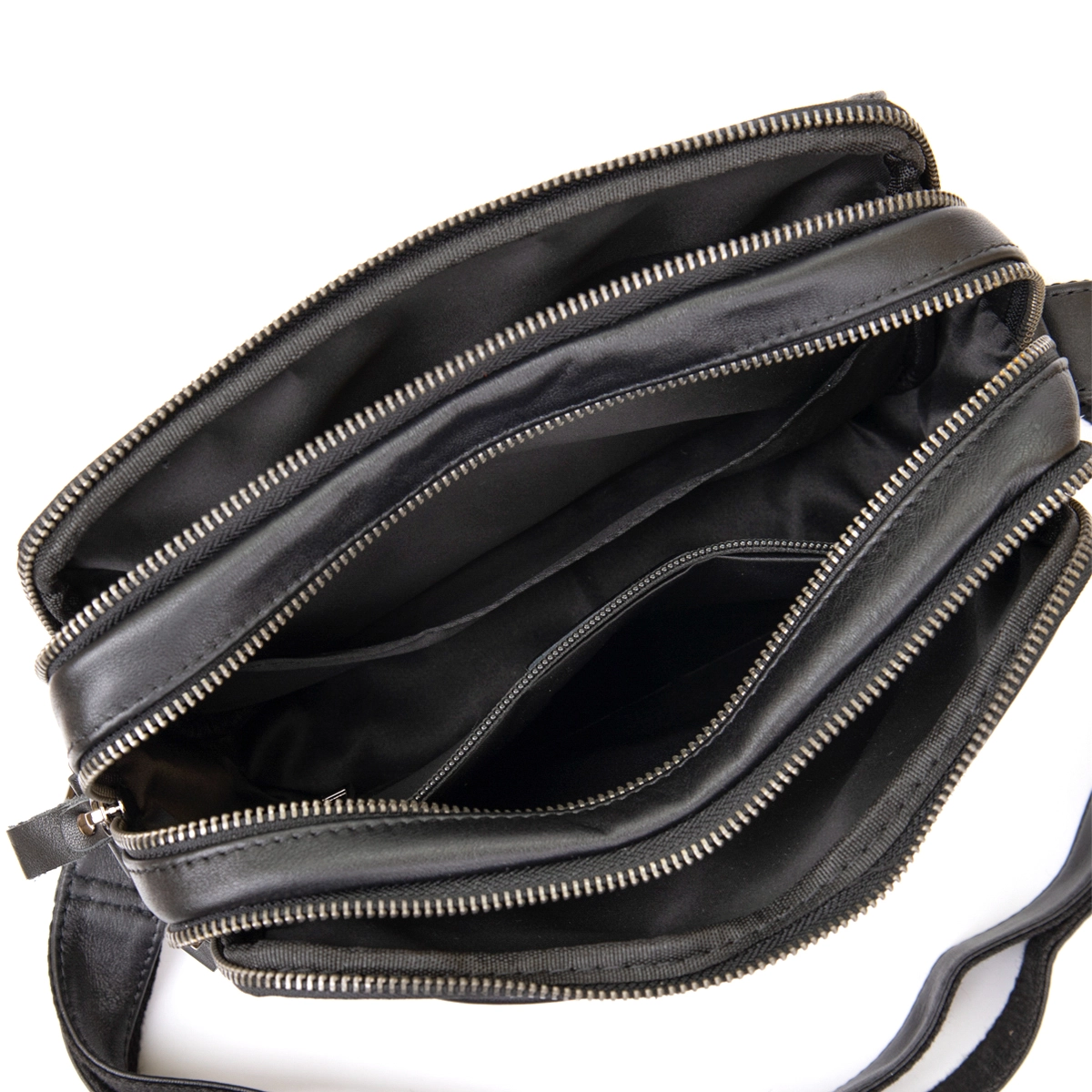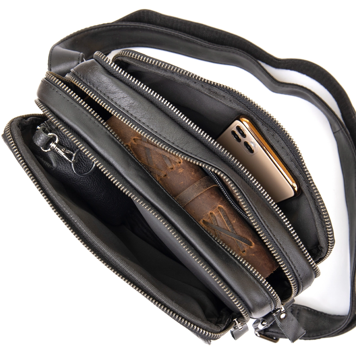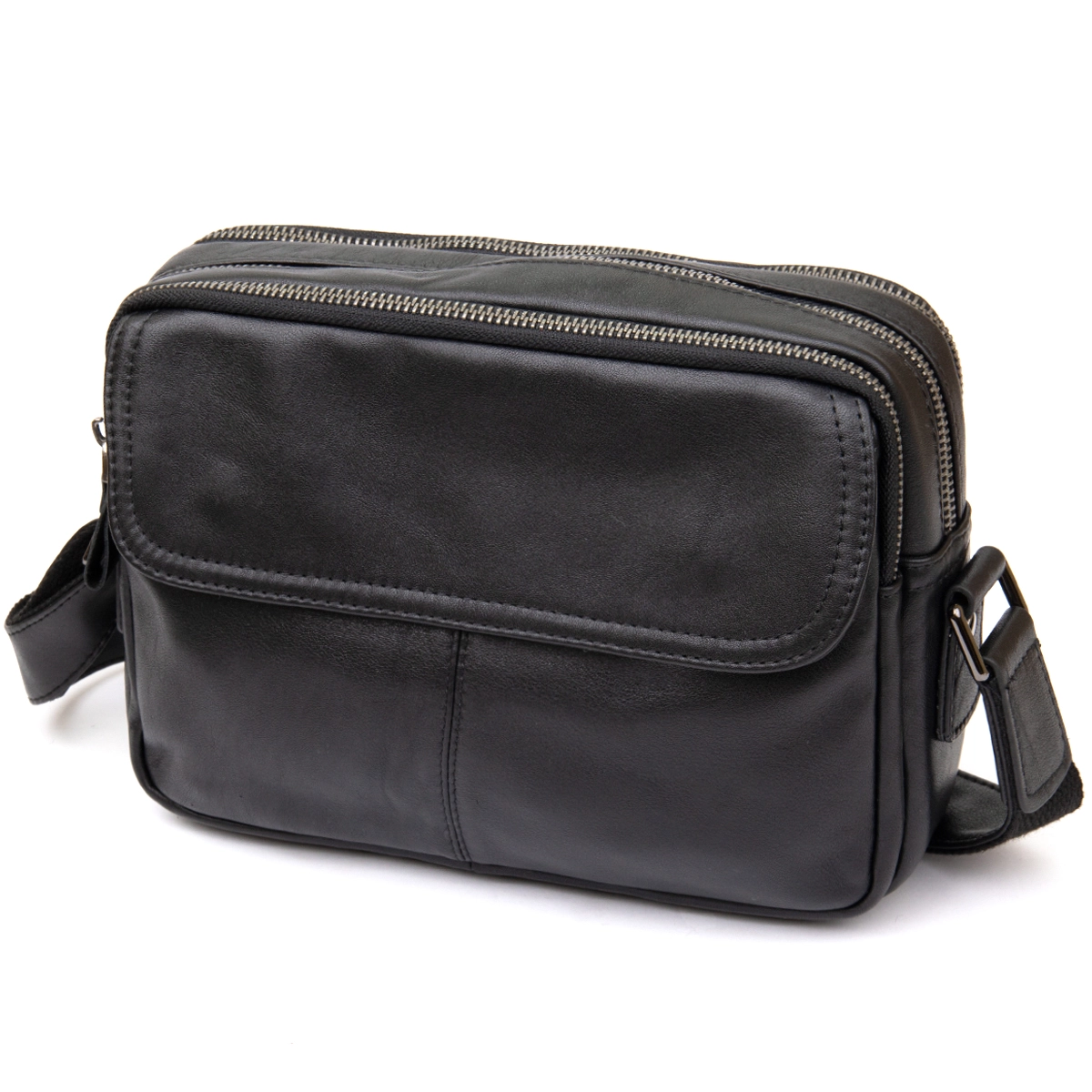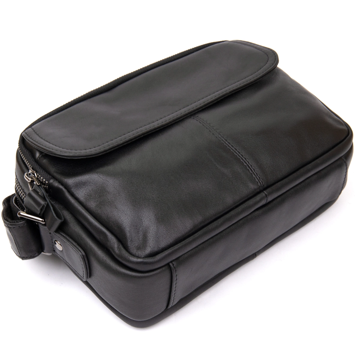 Отличная мужская сумка черного цвета. Аксессуар выполнен из натуральной высококачественной кожи, которая отличается легким, едва заметным блеском. Цвет фурнитуры: темное серебро. На лицевой стороне расположен небольшой карман под клапаном на магнитах. На задней внешней стороне находится вместительное отделение на молнии. Сумка имеет три автономных отделения, которые закрываются на молнии, внутри одного из них находятся два кармана (один из них на молнии). Подкладка выполнена из прочного текстильного материала коричневого цвета.