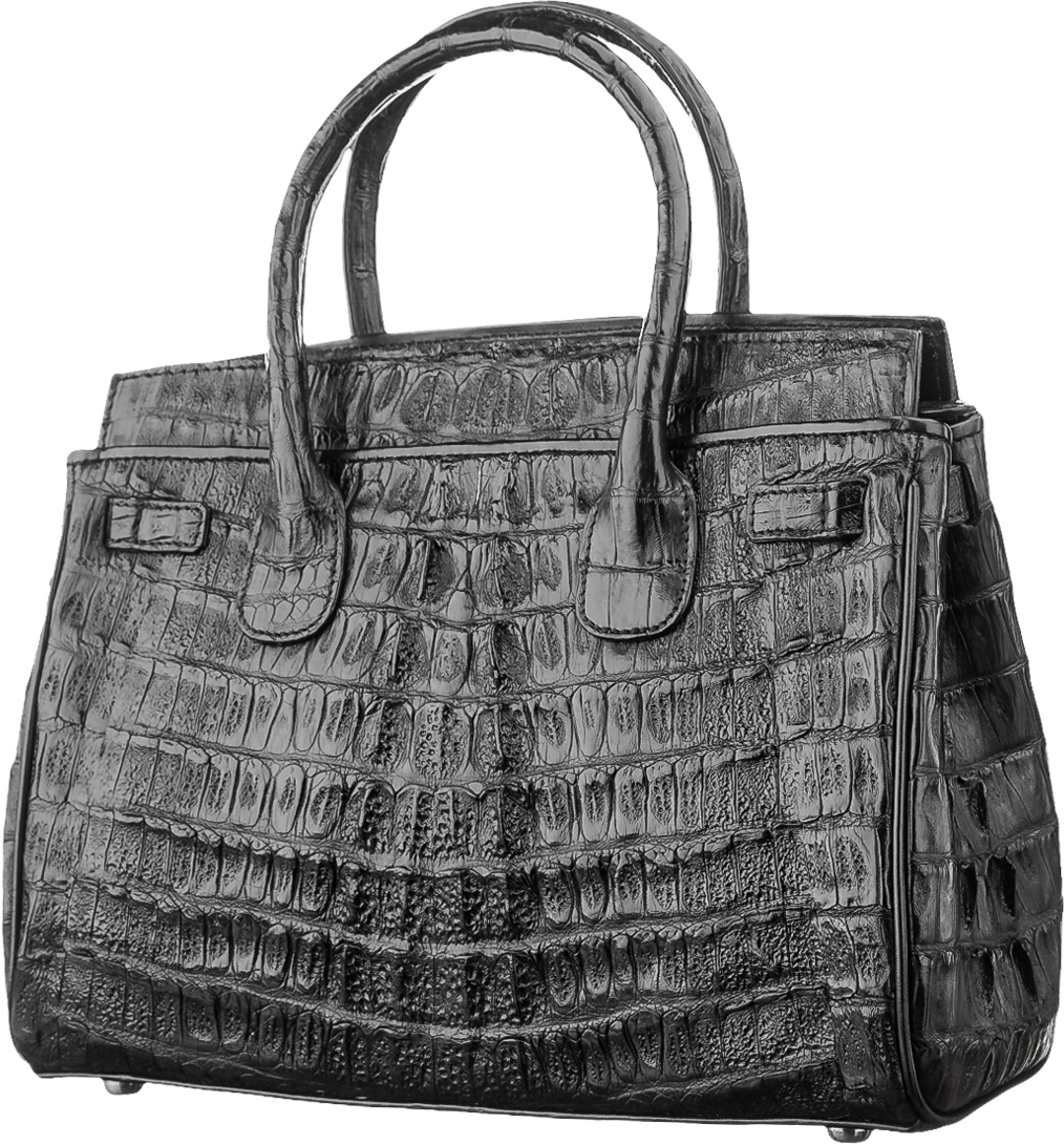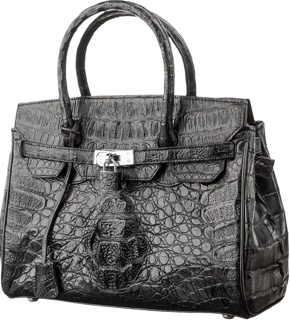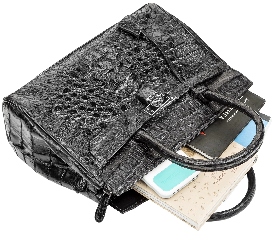 Неповторимая женская сумка из кожи крокодила, на лицевой стороне которой использована фактурная затылочная часть шкуры крокодила, на обратной стороне спинная часть шкуры, а по бокам - хвостовая часть. Каждое изделие из этого материала обладает своей необычной структурой и неповторимым узором. В качестве декора расположен ремешок, который закрывается на замок, к которому предоставлен ключ. В аксессуаре использована исключительно качественная фурнитура, серебряного цвета. Изделия из кожи крокодила всегда считались большой роскошью, так как в мире не так уж много компаний, которые занимаются выделкой такой кожи, поскольку этот процесс действительно чрезвычайно трудоемкий.