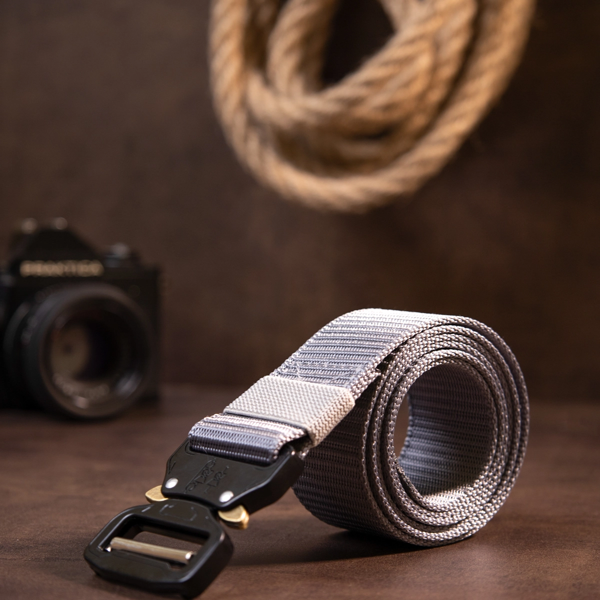 качественной пряжкой из плотного металла черного цвета. Текстильный