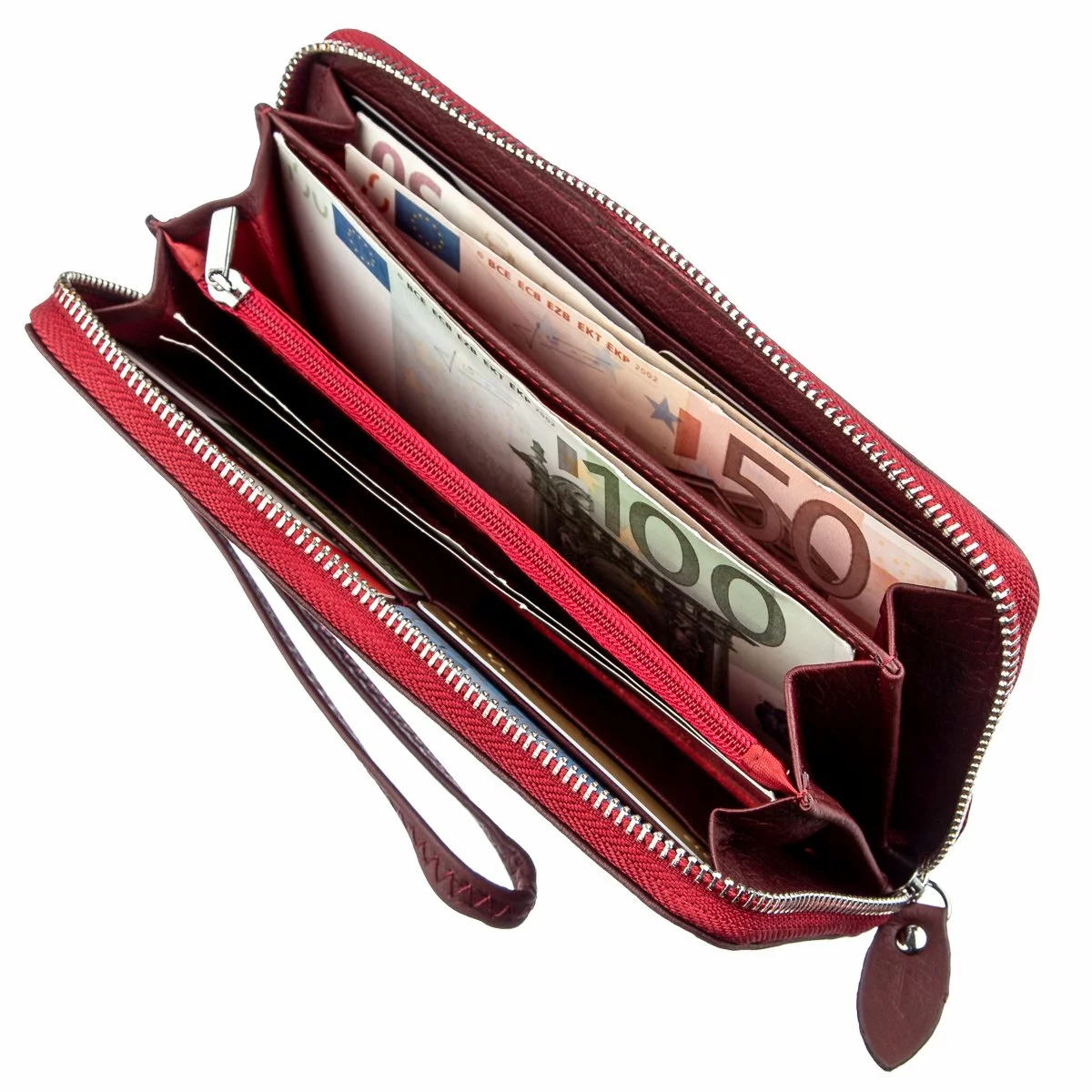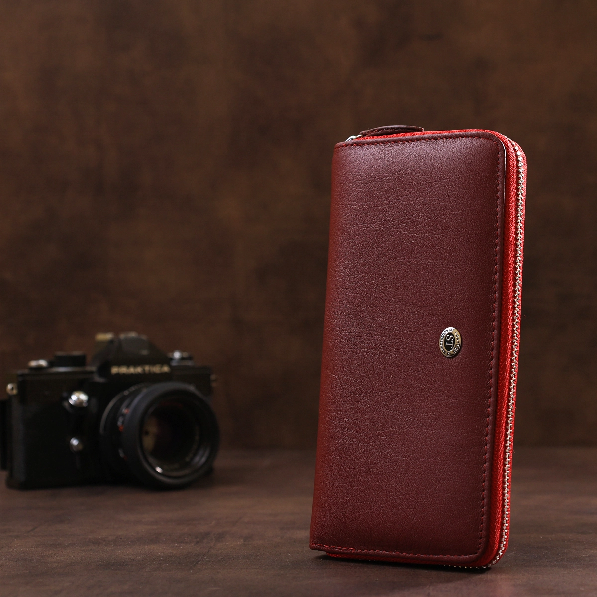 Эффектный женский клатч-кошелек в современном стиле и дизайне. Отлично подойдет для женщин в любом возрасте и положении. Изготовлен из перворазрядной натуральной кожи с отменной износостойкостью, кожа приятная на ощупь и имеет мягкую, зернистую фактуру. Цвет изделия – темно-красный, на вид неброский и выдержанный, но в то же время очень живописный. Носить аксессуар можно как в дамской сумочке, так и отдельно на запястье с помощью ремешка, который идет в комплекте. Такой клатч-кошелек станет для Вас просто незаменимым, также он может стать восхитительным подарком для любимой женщины. Упаковано изделие в плотную фирменную картонную коробку белого цвета.
