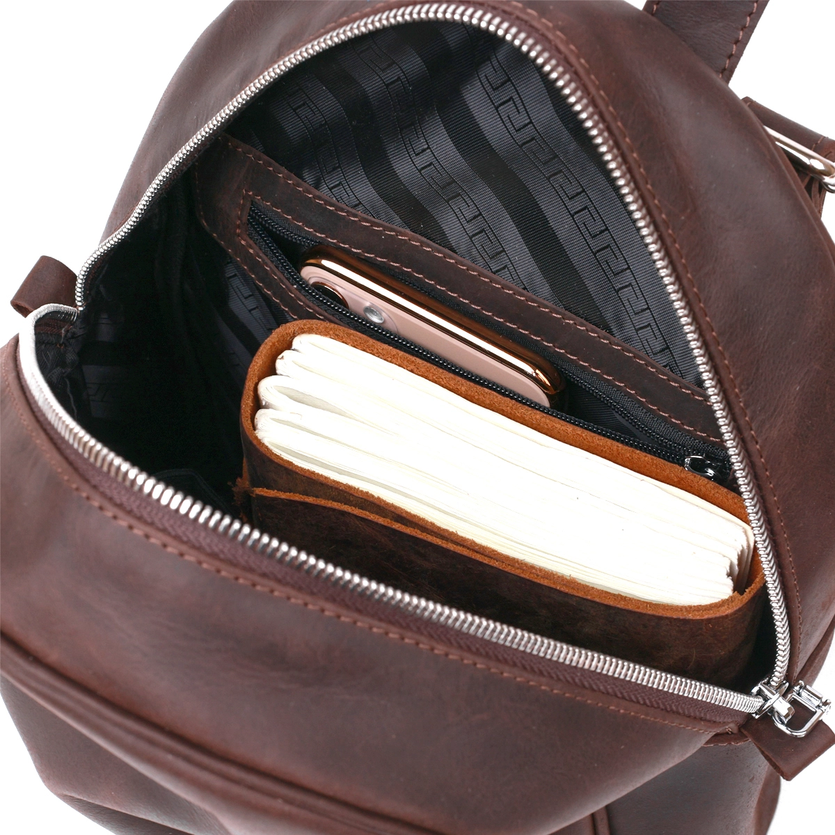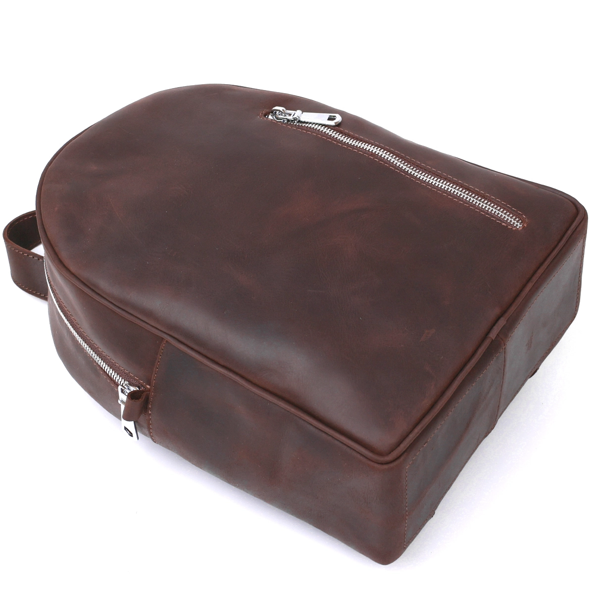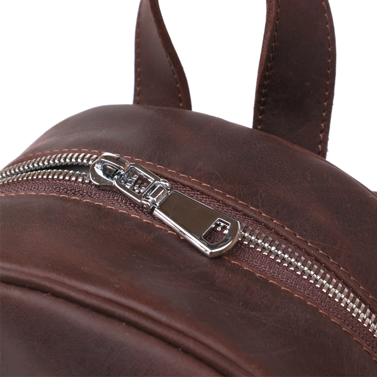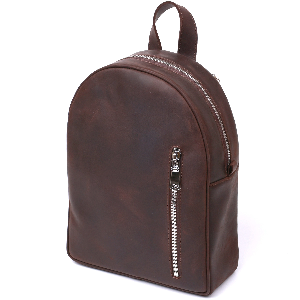 Стильный и практичный женский рюкзак небольшого размера для повседневного использования. Материал изготовления – натуральная высокопрочная кожа высокого качества. Цвет изделия – насыщенный коричневый, фактура – гладкая винтажная, что смотрится очень красиво. Внутри есть вместительное основное отделение и два кармана, на внешней стороне также есть вертикальный карман на молнии.