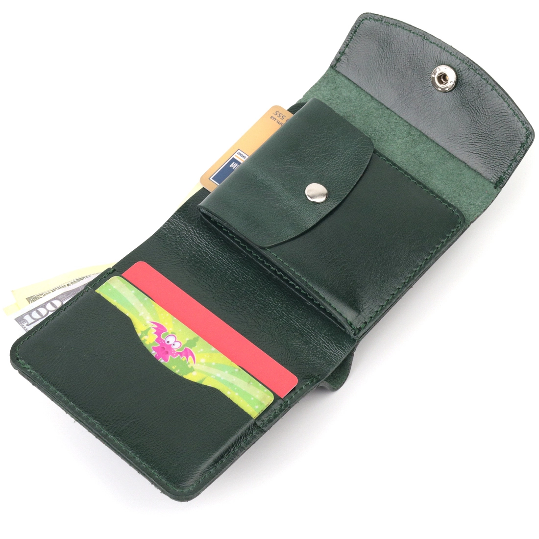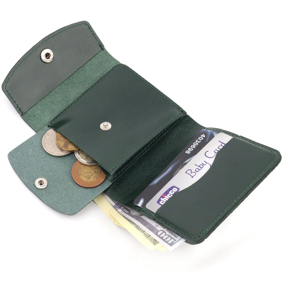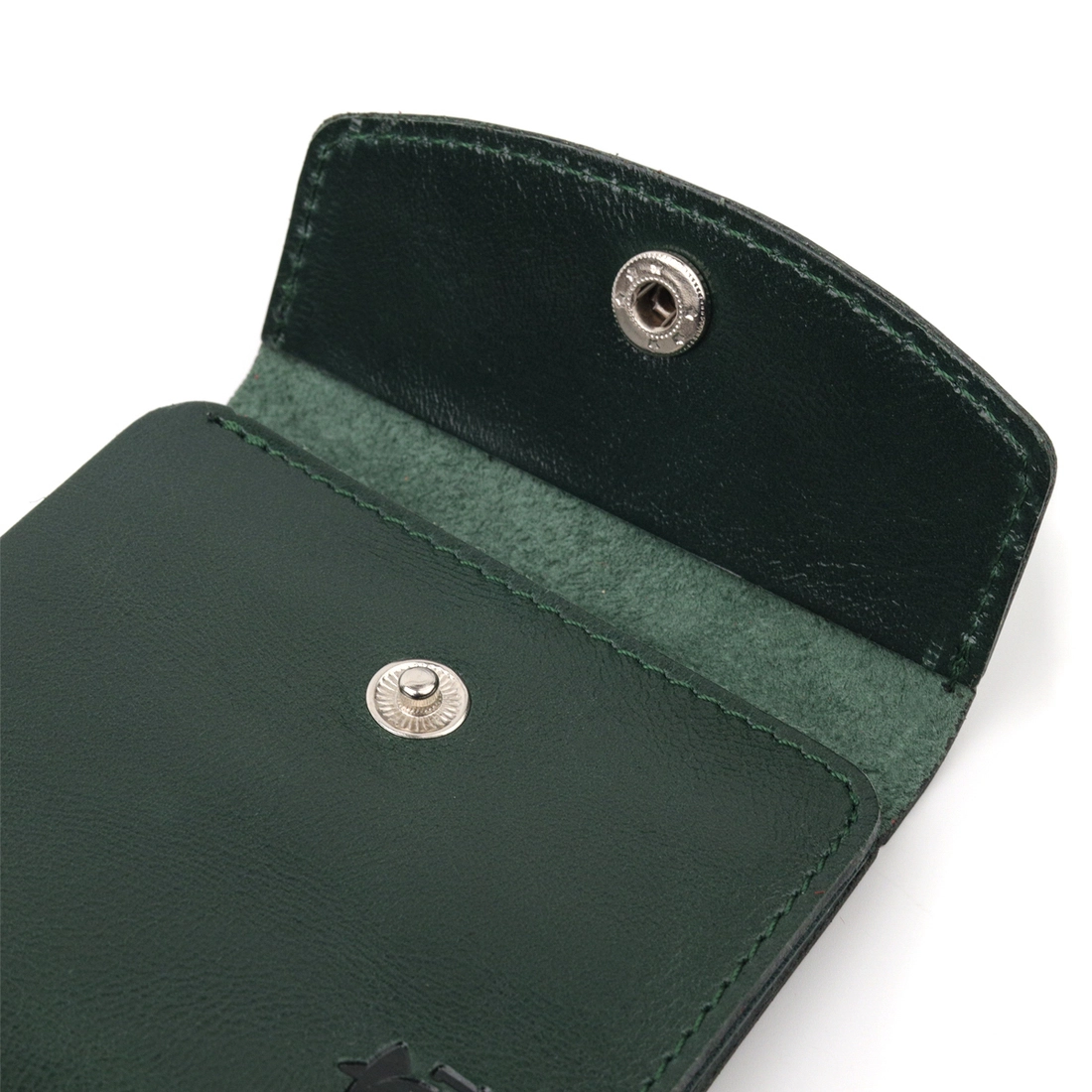 Закрывается кошелек хлястиком с кнопкой. Снаружи и внутри изделие