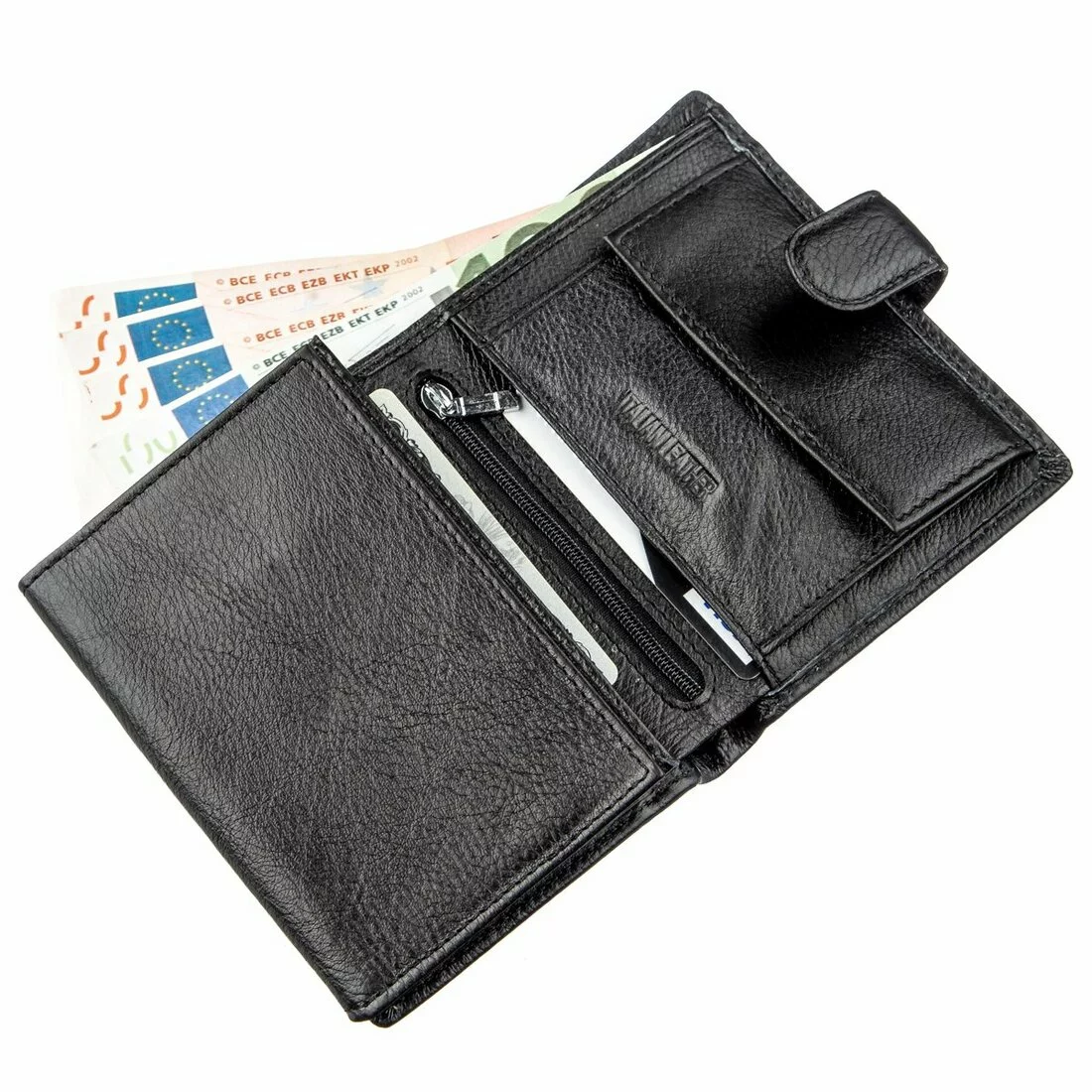 Великолепный кошелек для уверенного в себе мужчины, который превосходно подчеркнет чувство стиля и вкус хозяина этого аксессуара. Выполнен он из натуральной кожи сдержанного черного цвета. Кожа имеет прекрасные эксплуатационные характеристики, что позволяет утверждать о долгом сроке использования данного изделия. Бумажник имеет средние размеры и хорошо поместится как в кармане, так и в сумочке или борсетке своего хозяина. Имеет все необходимые отделения и карманы, таким образом, все Ваши ценности поместятся в данном бумажнике. Этот кошелек станет замечательным подарком любимому мужчине! Также хотим отметить, что кошелек упакован в плотную картонную коробку.