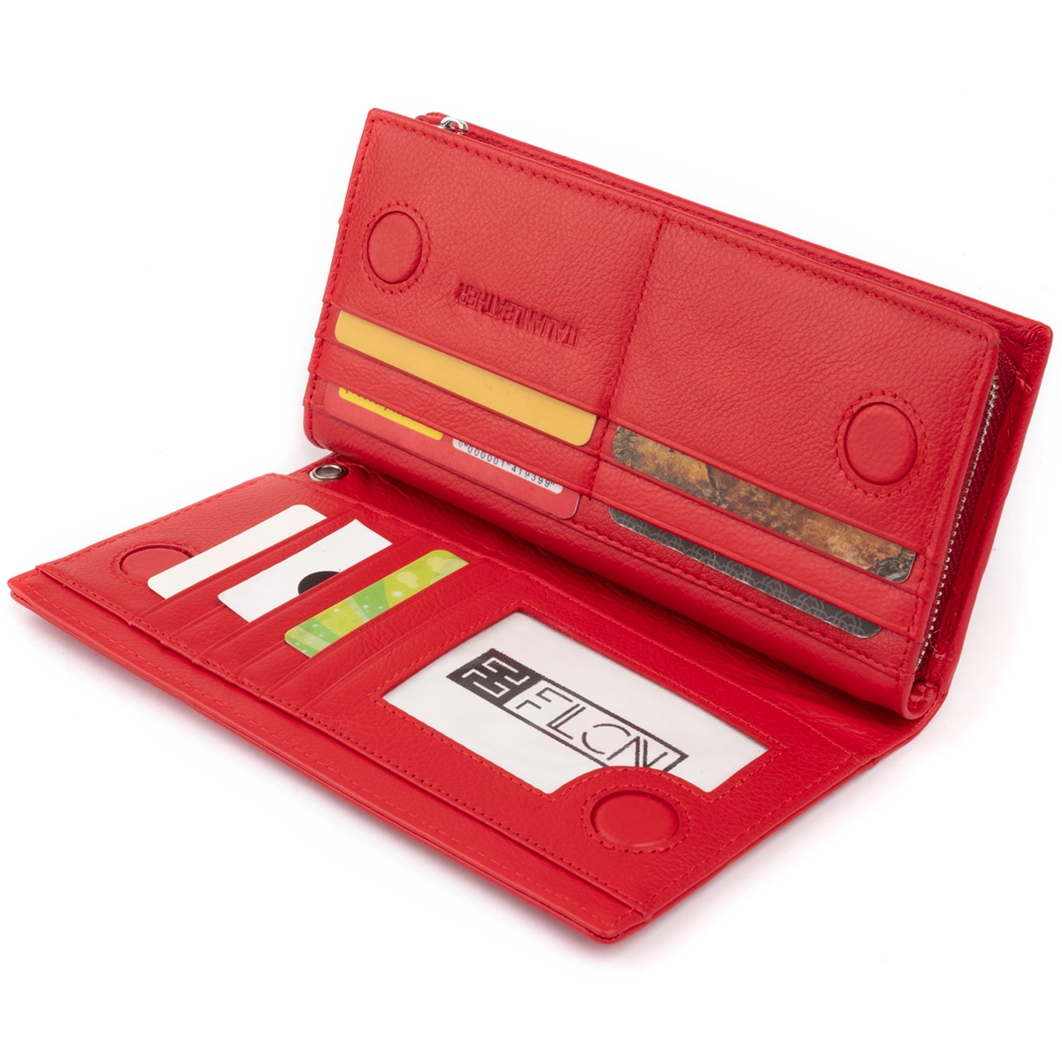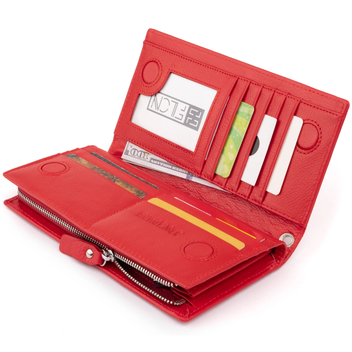 Яркий красный кошелек вертикального типа из натуральной кожи.