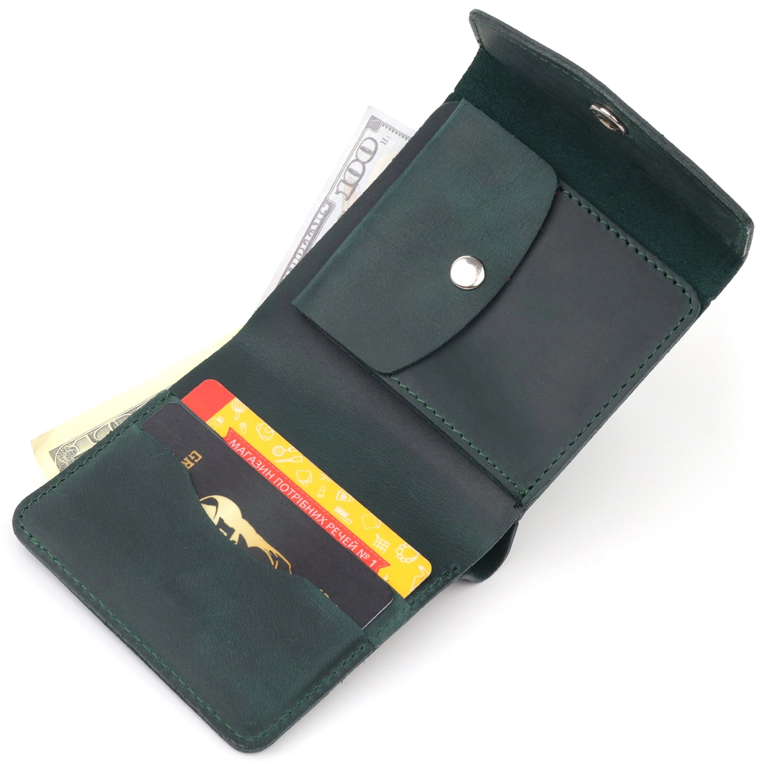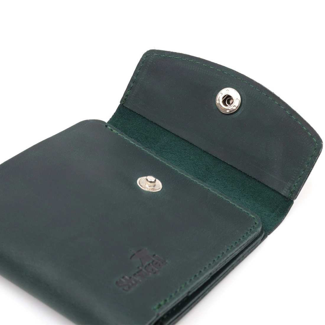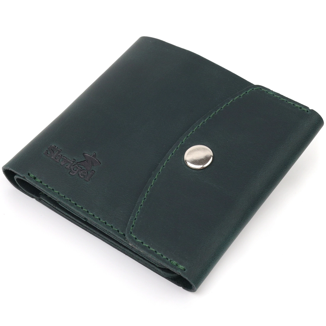 Винтажный компактний кошелек зеленого цвета, маленького размера, который легко поместится даже в самую маленькую сумочку. Аксессуар не займет много места и не имеет лишнего веса. Закрывается кошелек хлястиком с кнопкой. Снаружи и внутри изделие изготовлено из натуральной кожи. На лицевой стороне кошелек украшен тисненым логотипом Shvigel. Добротная винтажная кожа прослужит Вам очень долго.
