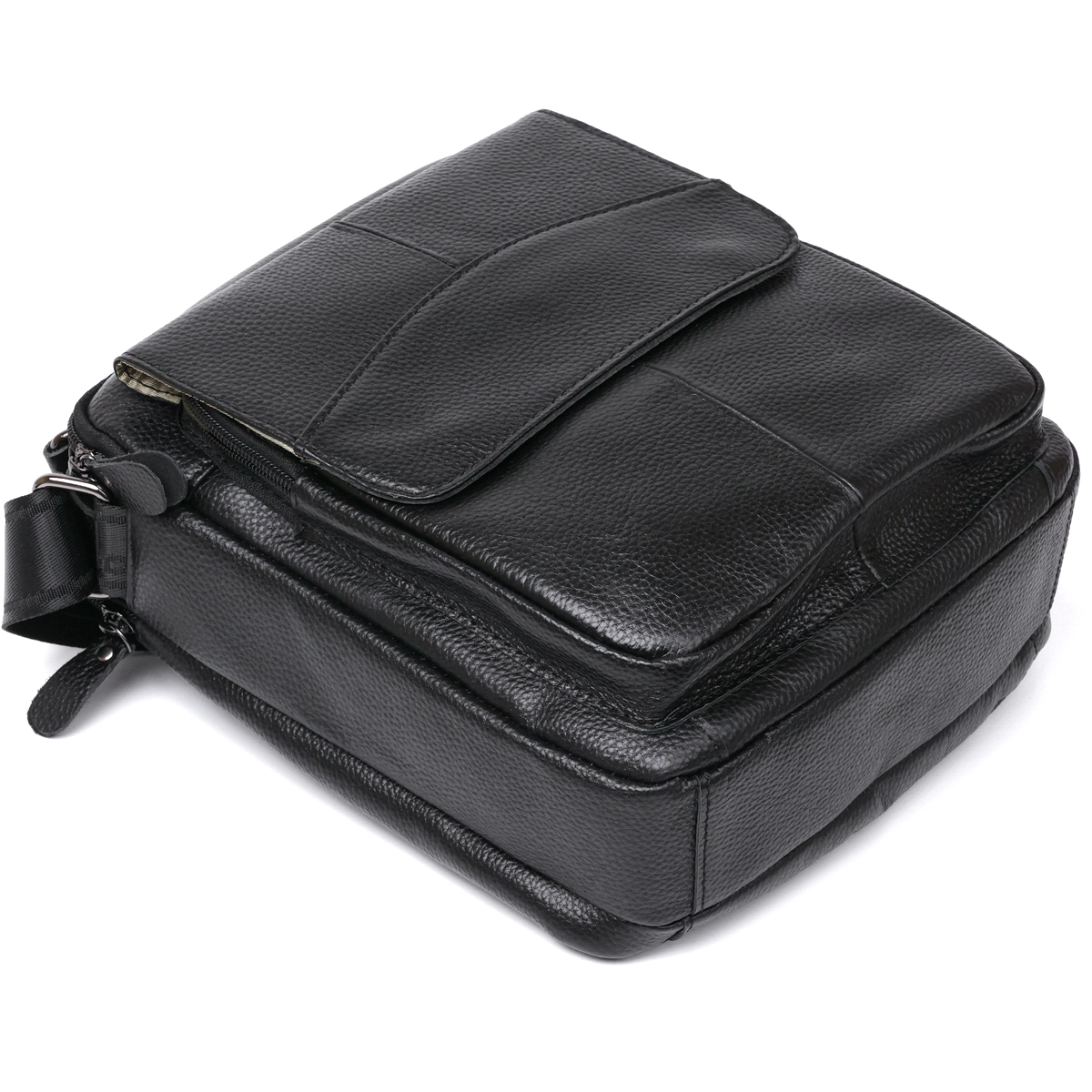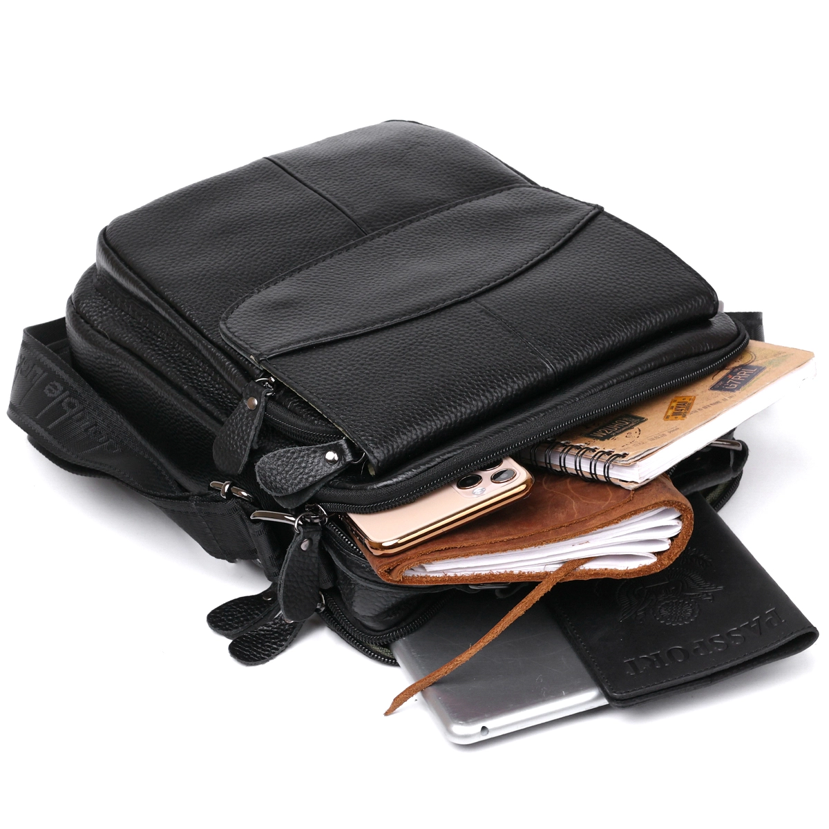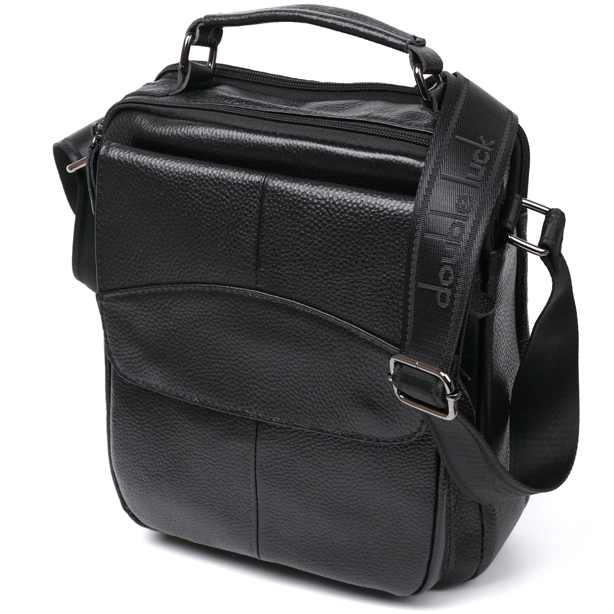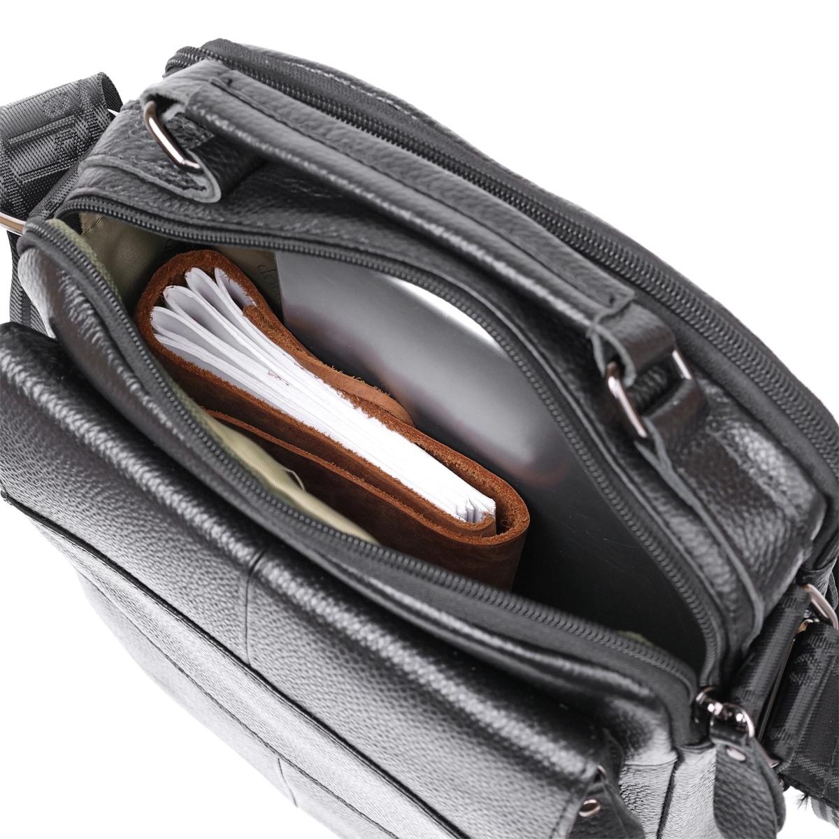 Вместительная мужская сумка стандартного размера из натуральной высокопрочной кожи. Имеет универсальный черный цвет и зернистую фактуру. Данная модель отлично подойдет тем, кому важно разместить все содержимое по отдельным карманам и отделениям. Сумку можно носить как в руке, так и через плечо. Ремень несъёмный, но регулируется по длине.