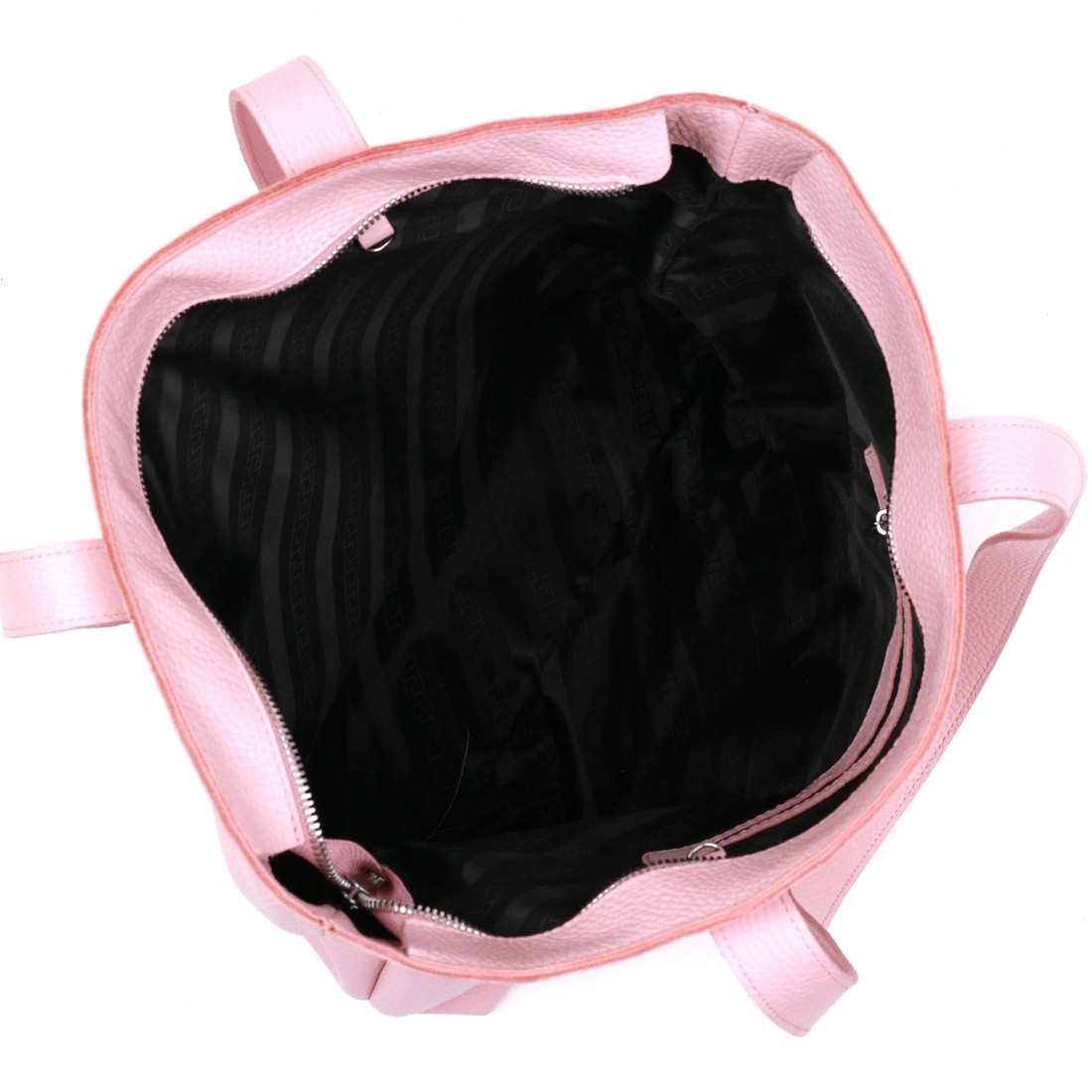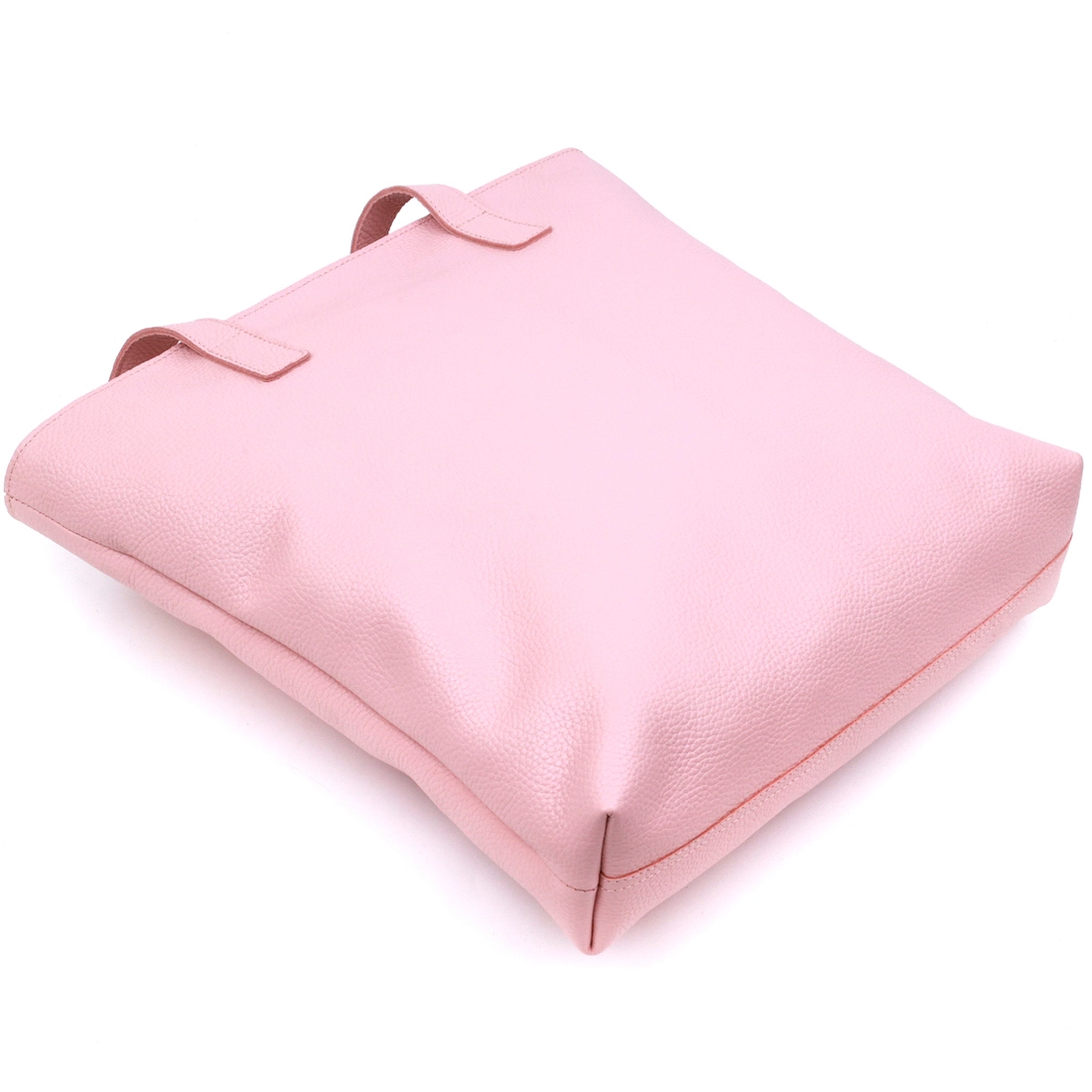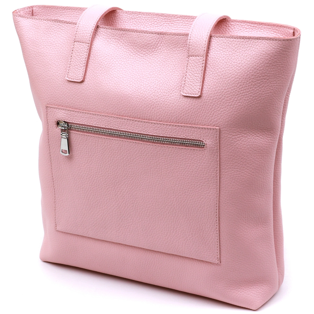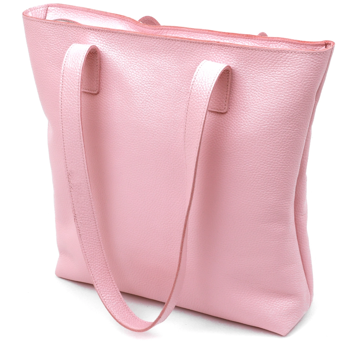 Отличная женская сумка-шоппер стандартного размера в современном дизайне. Материал изготовления – натуральная кожа высокого класса с высокими показателями прочности и стойкости к износу. Цвет данной модели – бледно-розовый, что смотрится очень нежно и красиво, фактура – зернистая. Основное отделение закрывается на молнию, на внешней стороне присутствует небольшой карманчик.