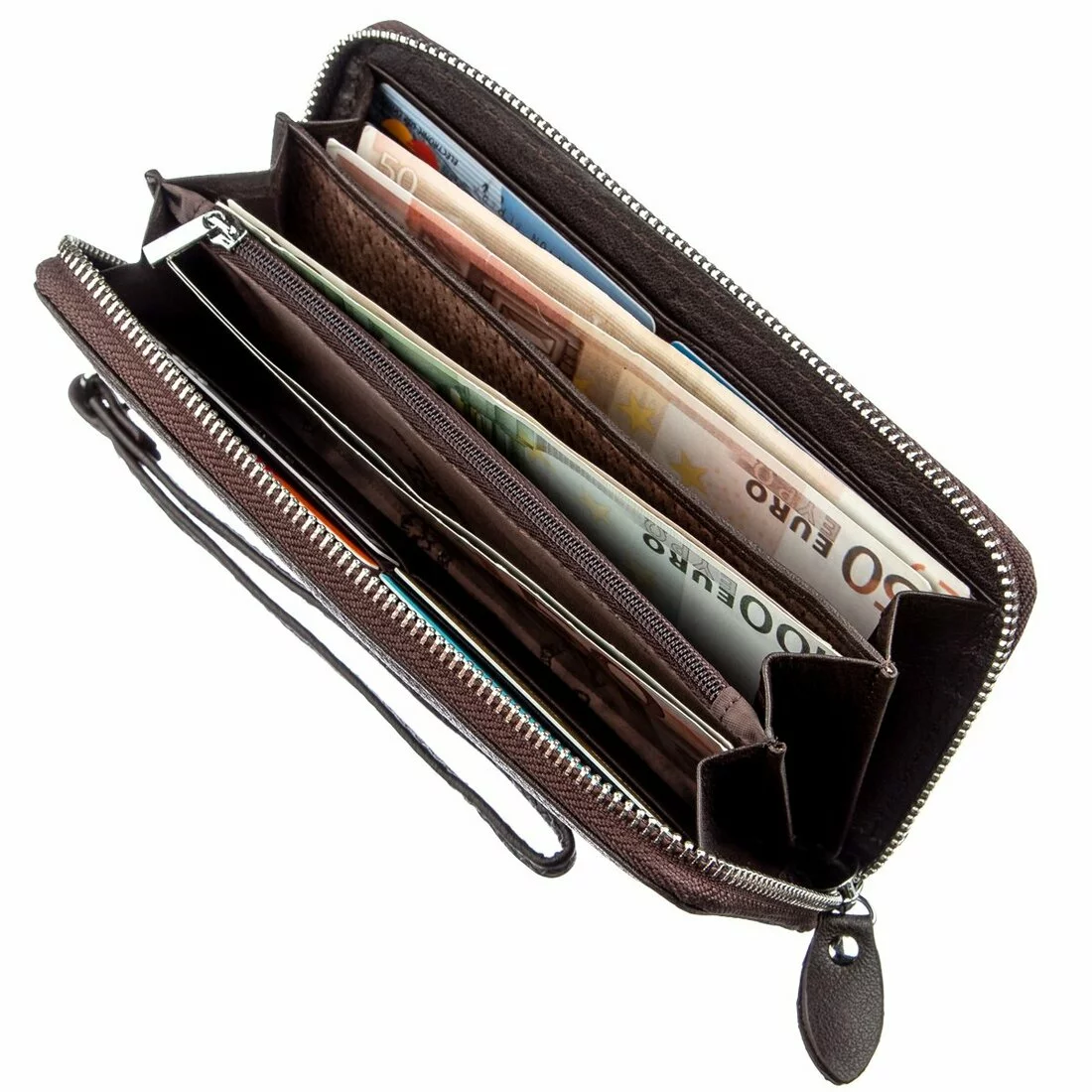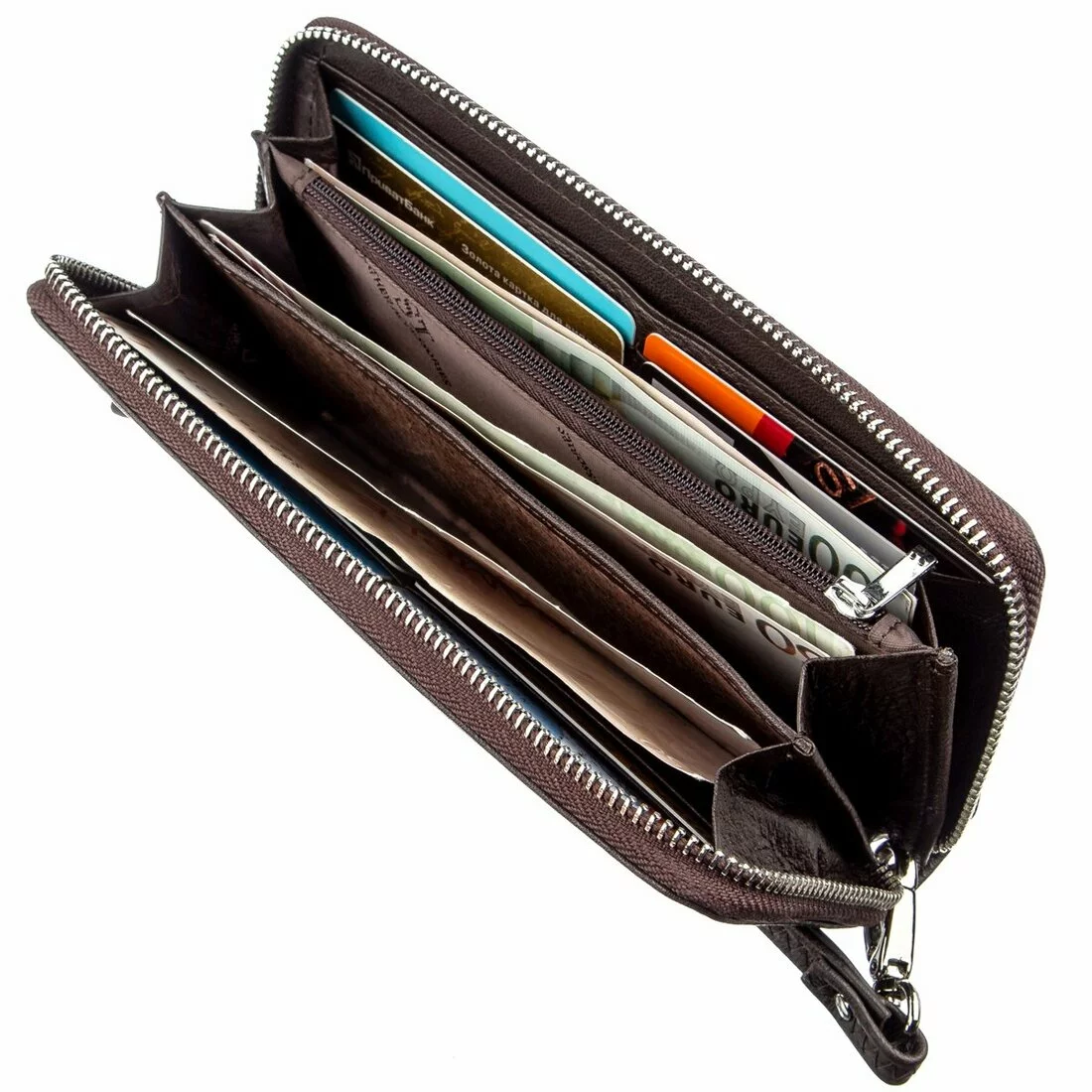 - женский клатч из натуральной кожи на молнии;