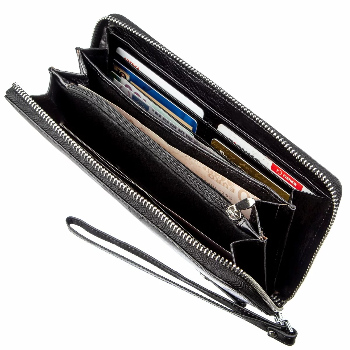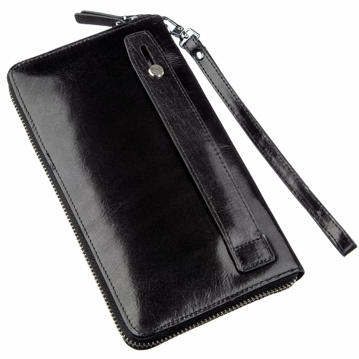 Очень вместительное и практичное мужское портмоне-клатч из высококачественной кожи черного цвета для уверенного в себе мужчины. Имеет все необходимое, чтобы стать Вам незаменимым аксессуаром в повседневной рутинной жизни. Вы с легкостью поместите в него бумажные купюры, монеты, документы и карточки. Такое портмоне непременно подчеркнет высокий уровень своего владельца. Этот клатч можно носить как в сумочке или портфеле, так и просто на запястье с помощью специального ремешка. Если же Вы решите такой аксессуар подарить близкому человеку, то Вам гарантированно будут очень благодарны. Также отмечаем, что упаковано портмоне-клатч в фирменную картонную коробку.