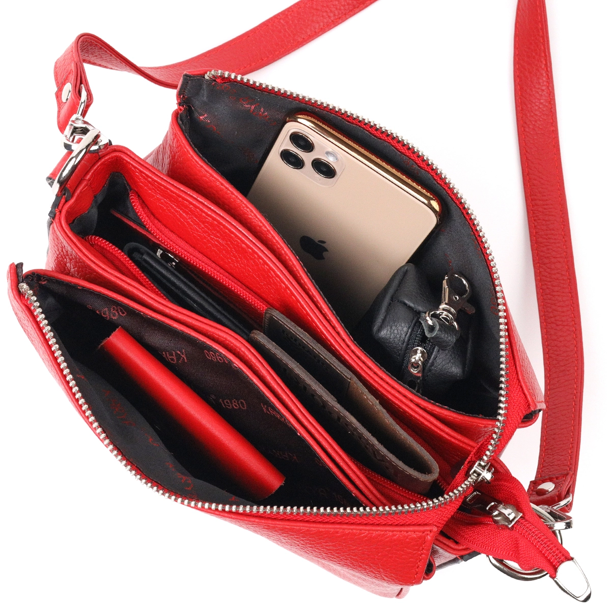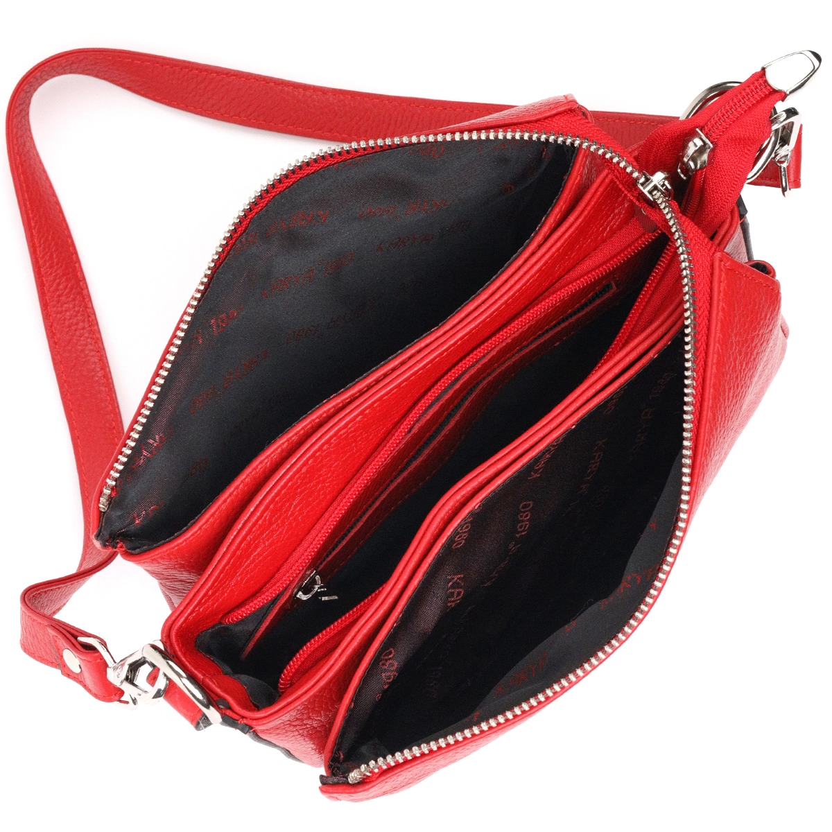 Женская сумка небольшого размера из натуральной кожи, в красном цвете. Фурнитура серебряного цвета. Сумку удобно носить в руке, на плече или через плечо. Сумка упакована в фирменный текстильный чехол Karya. Сумка из натуральной кожи всегда будет отличным подарком любой женщине.