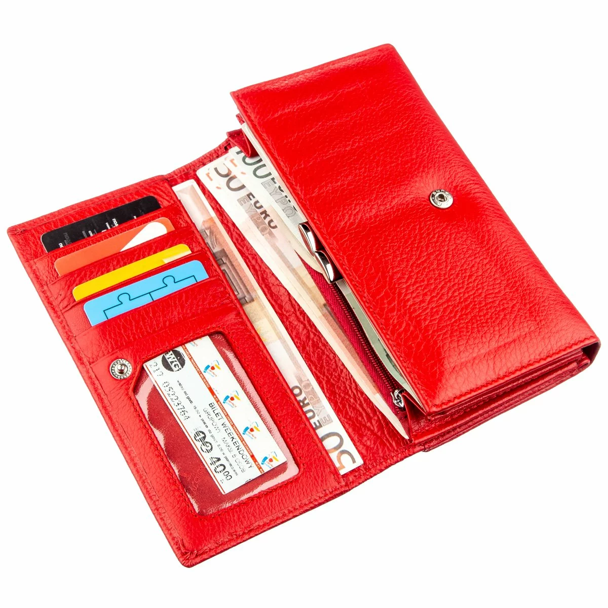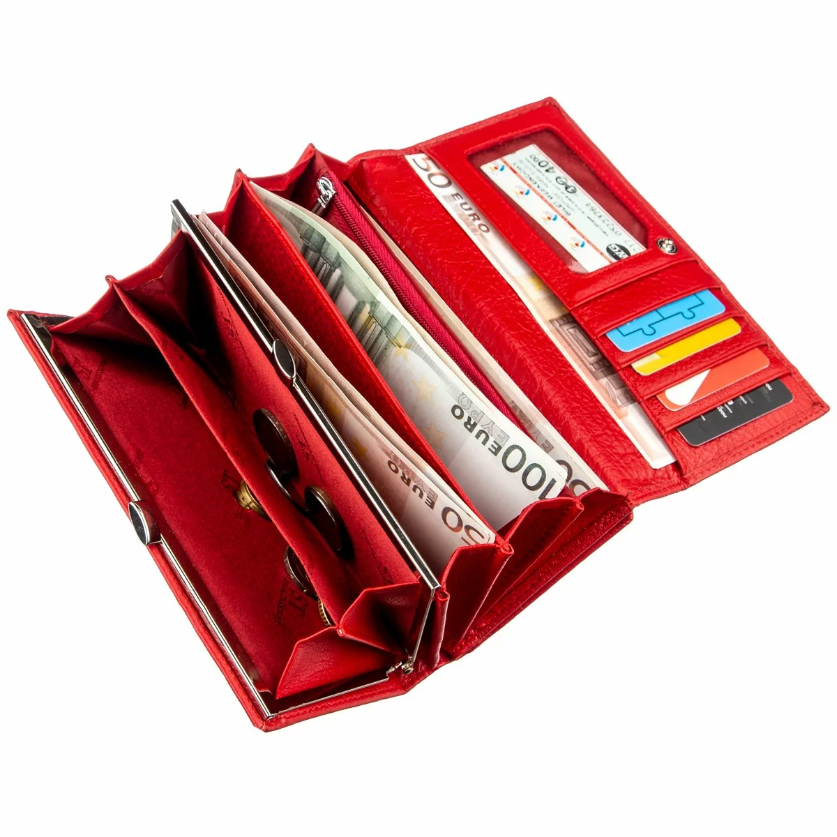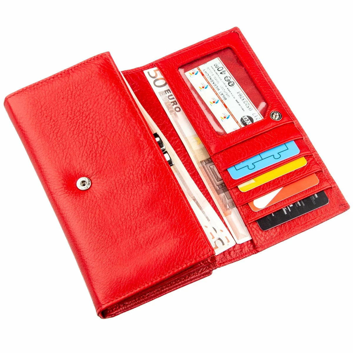 Восхитительный яркий женский кошелек из натуральной кожи с отменными характеристиками. Цвет – ярко-красный с матовым оттенком. Подойдет женщинам, которые хотят всегда быть в центре внимания. Кошелек отличается своею функциональностью и практичностью, имеет много необходимых отделений и карманов, в которые с легкостью поместятся купюры, монеты, фото, карточки и визитки. Следует отметить, что монетница закрывается на удобную металлическую защелку. На внешней стороне расположена визитница на одиннадцать карманов. Продается кошелек в плотной картонной белой коробке с логотипом производителя.