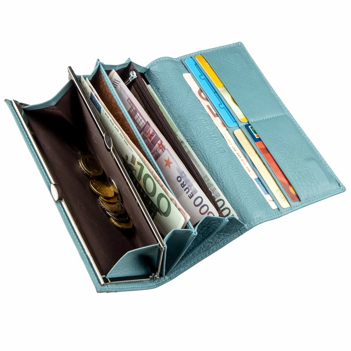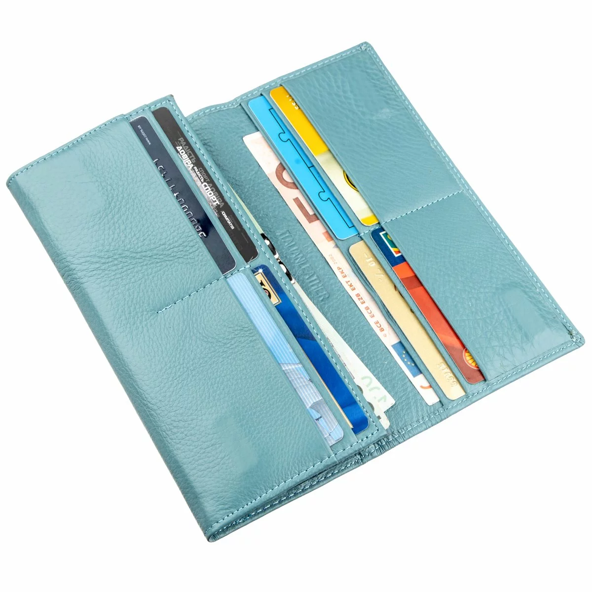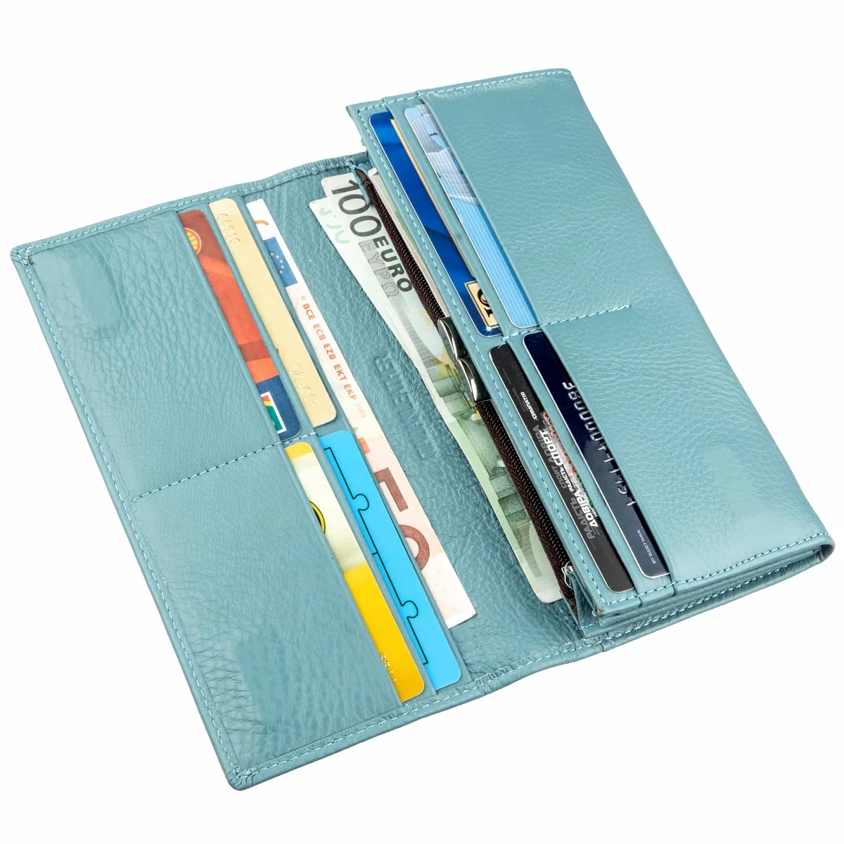 Шикарный кошелек для удивительных женщин с отличным вкусом. Выполнен из натуральной кожи с прекрасными эксплуатационными свойствам. Кожа мягкая и приятная на ощупь, а также имеет зернистую фактуру. Изделие имеет освежающий цвет морской волны с матовым оттенком. Закрывается бумажник на два расположенных по бокам магнита, что очень удобно при открывании. Внутри Вас порадуют просторные и вместительные отделения для купюр, монет, карточек и прочих ценностей. Такой кошелек – это лучший подарок любимой женщине по любому поводу, да и без повода тоже! Продается кошелек в плотной картонной белой коробке с логотипом производителя.
