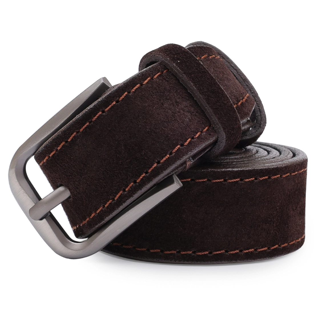Модный и современный замшевый ремень в очень красивом темно-коричневом цвет с шоколадным оттенком, а по бокам идет строчка чуть светлее, что смотрится просто шикарно. Материал изготовления – натуральная высококачественная кожа с отменными эксплуатационными характеристиками. Такой ремень – просто находка для Вашего гардероба.