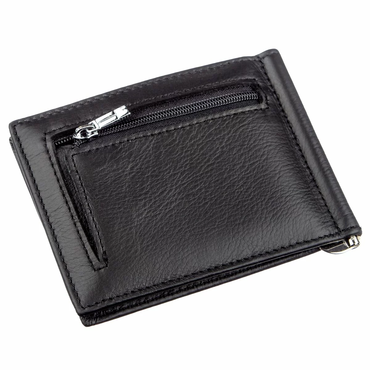 Строгий мужской зажим для купюр в деловом и выдержанном стиле. Данный аксессуар очень популярен в наше время и отлично подойдет тем людям, которые не любят носить с собой громоздкие и тяжелые кошельки, при этом купюры в карманах теряются и мнутся. Поэтому перед Вами отличный вариант небольшого бумажника. Изготовлено изделие из первоклассной натуральной кожи с зернистой фактурой. Материал имеет отменные эксплуатационные характеристики и свойства. Цвет самый практичный и ходовой – насыщенно черный с матовым оттенком. Небольшая монетница расположена на внешней стороне и закрывается на молнию. Упакован зажим в фирменную картонную коробку.