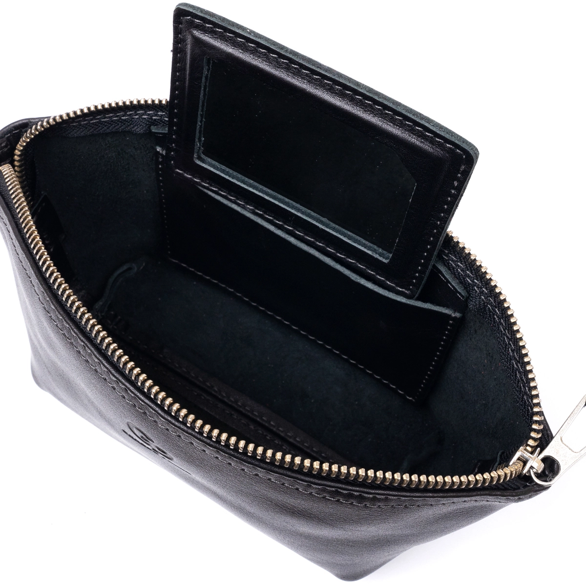 Аксессуар закрывается на молнию. Внутри косметички - зеркальце. С