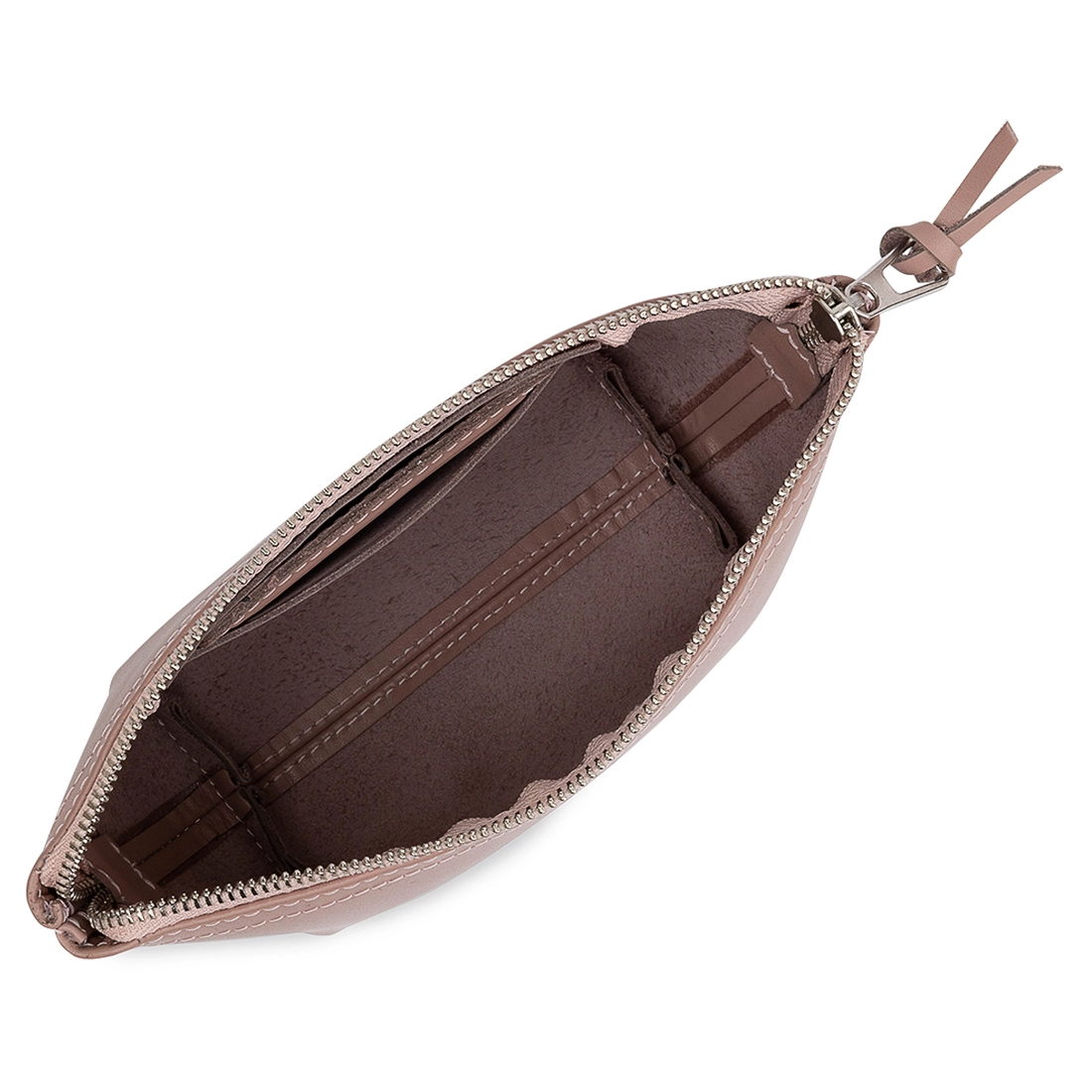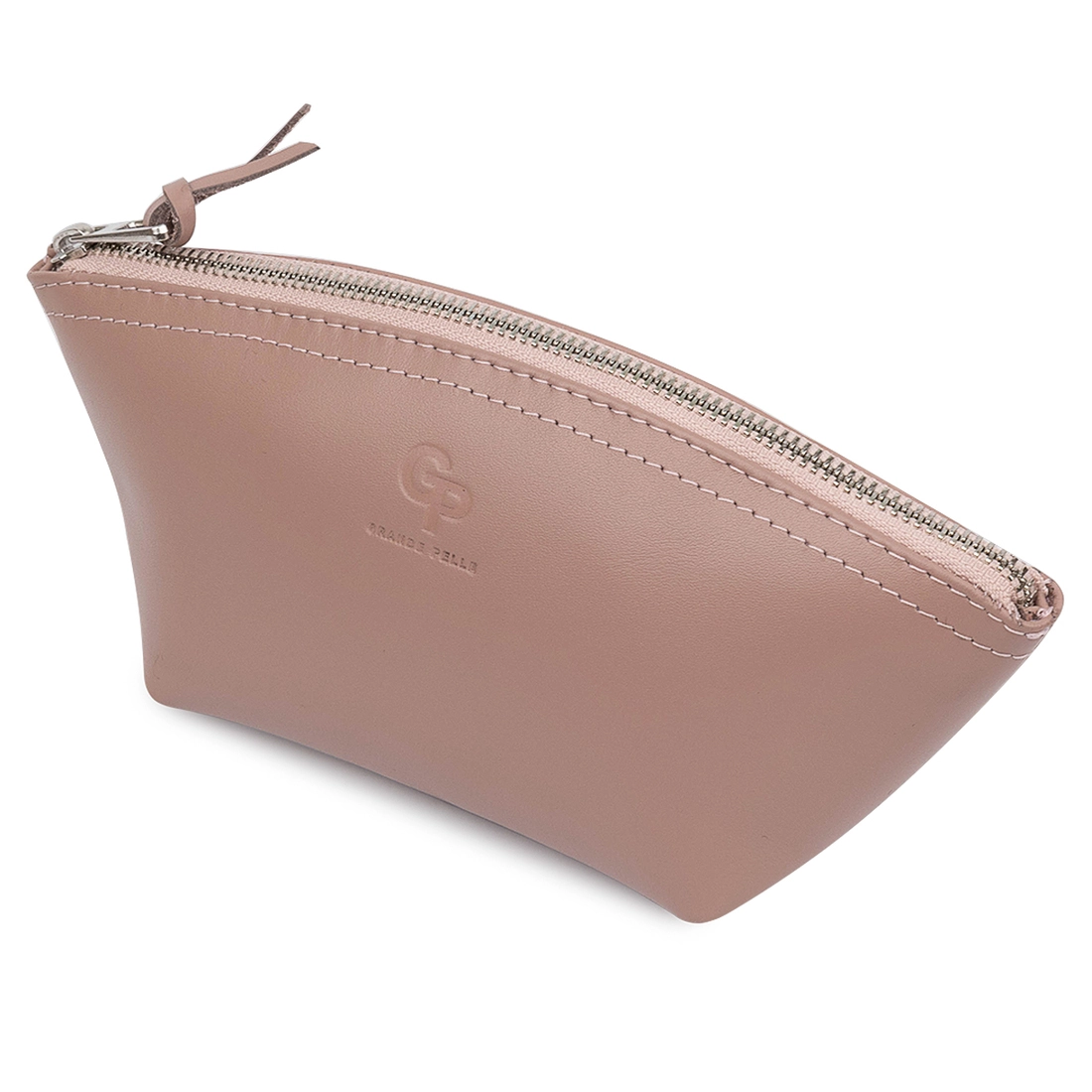 Очаровательная женская косметичка из натуральной кожи, которая устойчива к износу. Имеет нежный бледно-розовый цвет и гладкую фактуру. Внутри есть небольшой карманчик для зеркальца, которое идет в комплекте и имеет кожаную оправу. Закрывается изделие на удобную и надежную молнию.
